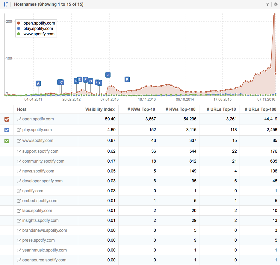 Como siempre, empezamos analizando los subdominios. Aquí, veremos claramente que el subdominio open.spotify.com, era responsable de gran parte de la visibilidad del dominio y es quien ha sufrido la caída.
