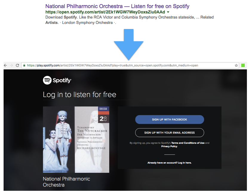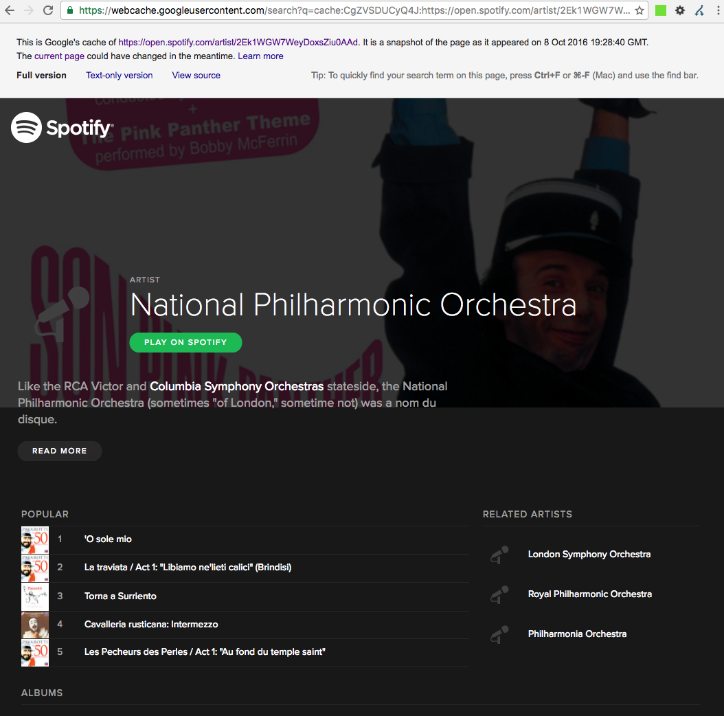 Ahora que ya sabemos dónde radica el problema, falta descubrir que ha pasado exactamente en el dominio. Si pulsamos en el recuadro pequeño de cada URL del directorio contenida en open.spotify.com/artist/, descubrirás que es lo que está pasando. Para la palabra clave “National Philharmonic Orchestra“ por ejemplo, Spotifiy.com se posiciona usando esta URL: open.spotify.com/artist/2Ek1WGW7WeyDoxsZiu0AAd. Si pulsas sobre la URL o sobre su resultado correspondiente en Google, serás redirigido a otra URL alojada en play.spotify.com/artist/, y verás algo así: