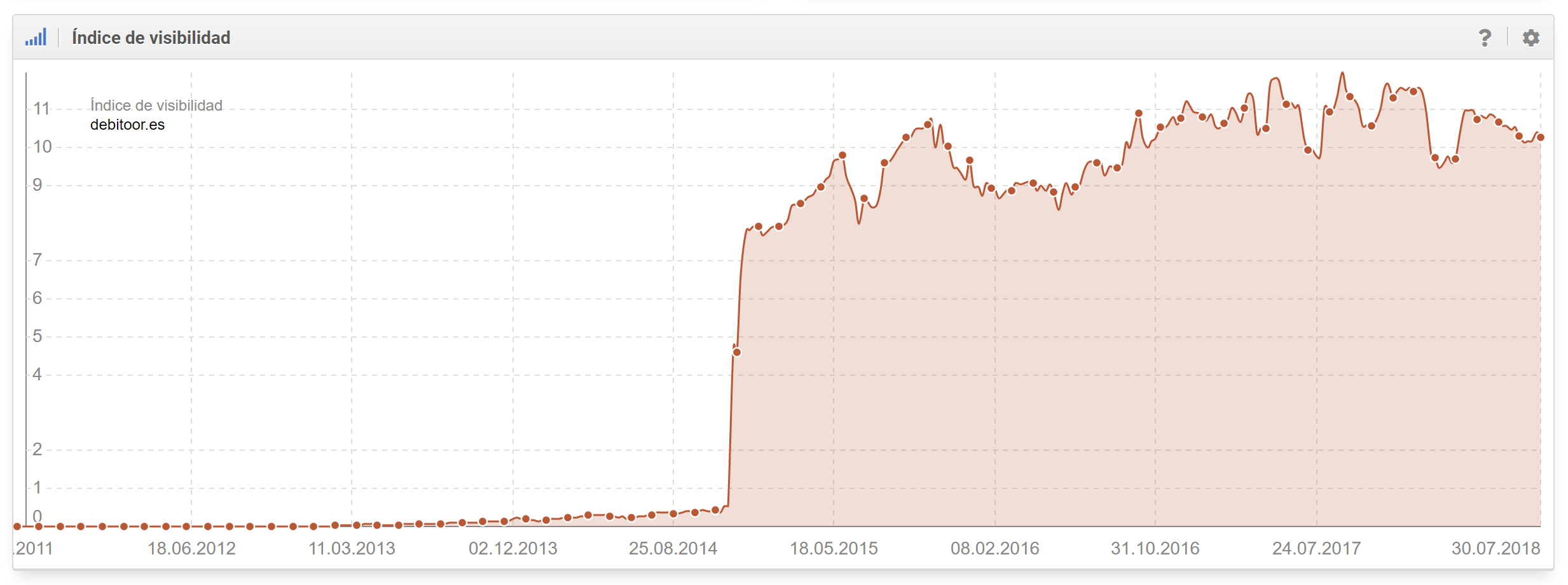 Tal y como se ve en el gráfico de evolución del índice de visibilidad, fue a finales de 2014 cuando este software de facturación dio un salto gigante en cuanto a la visibilidad de su web. Debitoor pasó de tener 0,541 puntos de visibilidad a 7,831 puntos sólo un mes después. ¿Pero qué ocurrió para que ganaran tanta visibilidad de golpe?