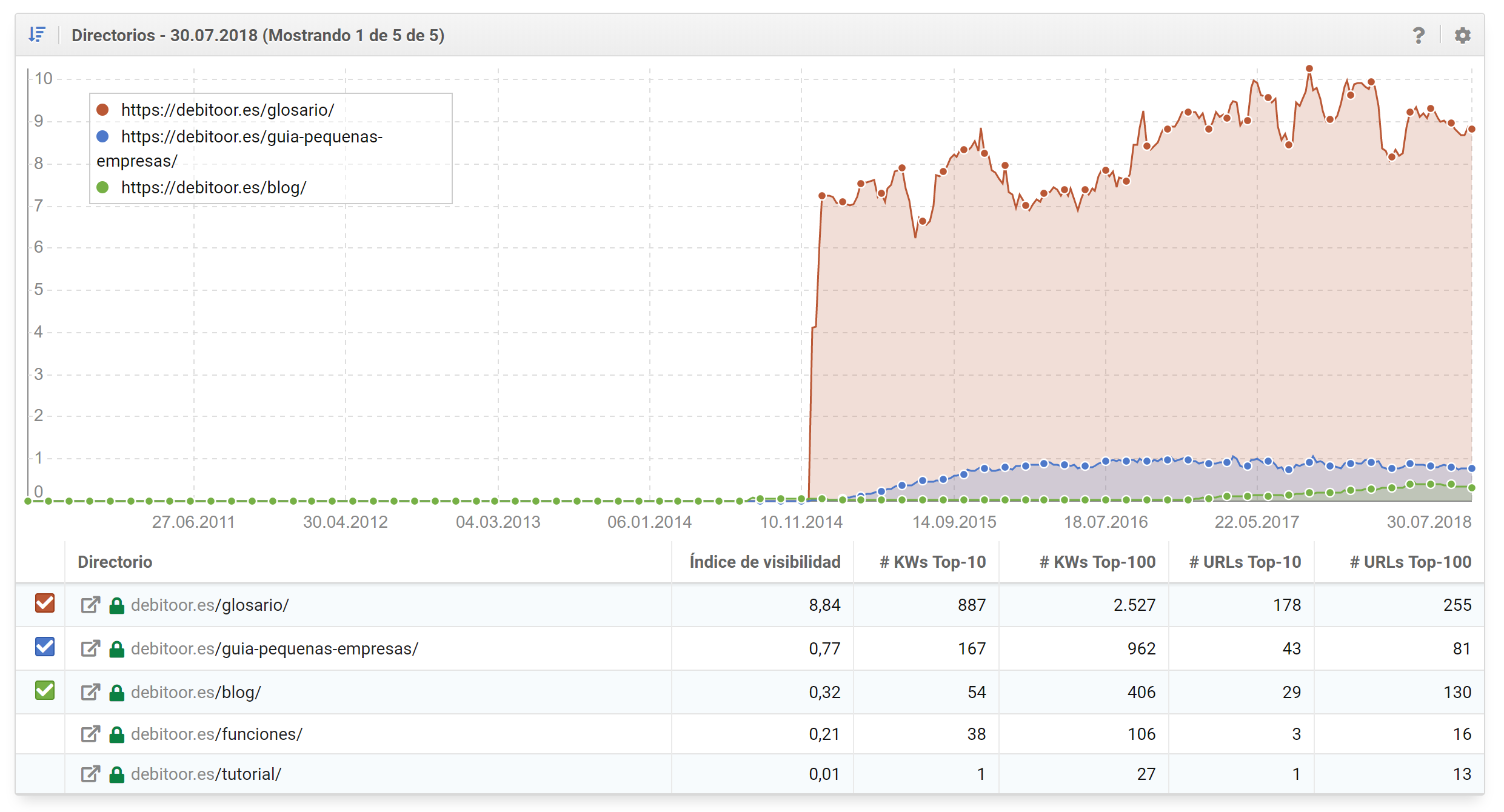Este gráfico muestra claramente que el directorio que está “tirando del carro” en Debitoor es el glosario. Un glosario contable que llevan trabajando inHouse en su dominio desde 2014, representando el 85,47% del total de su visibilidad con 8,88 puntos.