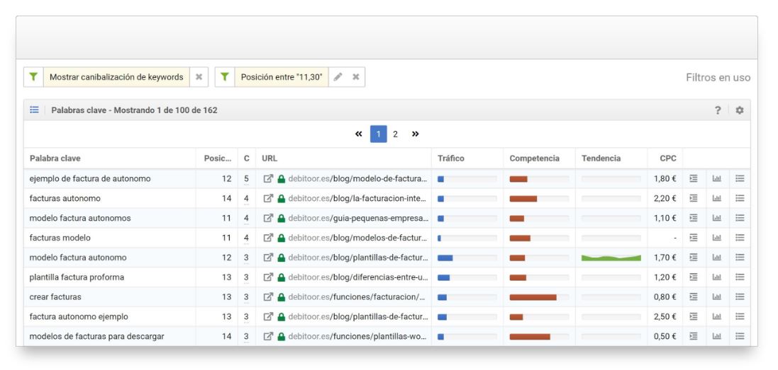 Debería revisarse la canibalización de palabras clave dentro de la web. Hay varias palabras clave por las que llegan a posicionar hasta 5 URLs diferentes. (Palabras clave > canibalización de keywords > filtro: Posición). Esto implica que con un pequeño esfuerzo, ellos mismos podrían aumentar su visibilidad en las SERPs de Google.