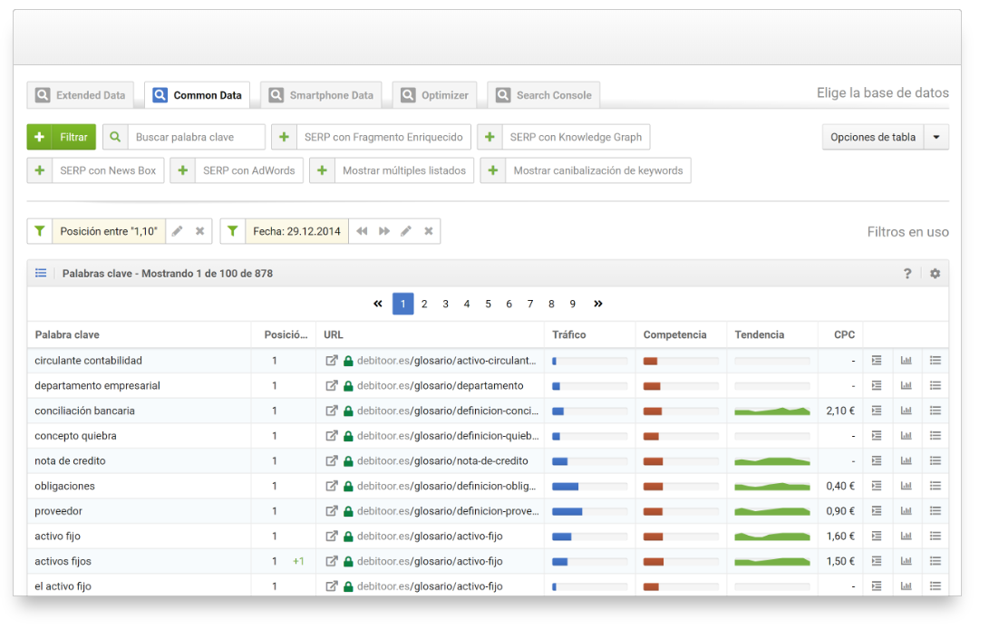 Una semana después, el 01 de diciembre de 2014 tenía posicionadas 1950 palabras. Si tenemos en cuenta la subida vertical total, veremos que en tan solo un mes, el 29 de diciembre de 2014, Debitoor posicionaba un total de ¡2847 palabras clave! de las cuales 878 llegaron a primera página.