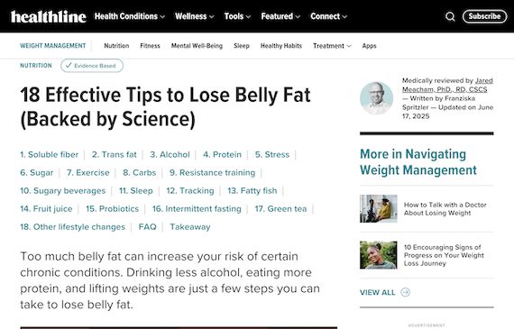 Ejemplo: Todos los portales de salud como my.clevelandclinic.org o healthline.com incluyen menciones como «Medically Reviewed by…» directamente bajo el título. Otras webs presentan a sus expertos de forma destacada.