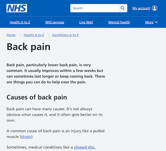 - Ejemplo: Las páginas my.clevelandclinic.org y nhs.uk están casi siempre estructuradas del mismo modo: 1. Overview (Resumen general), 2. Symptoms and Causes (Síntomas y causas), 3. Diagnosis and Tests (Diagnóstico y pruebas), 4. Management and Treatment (Tratamiento).