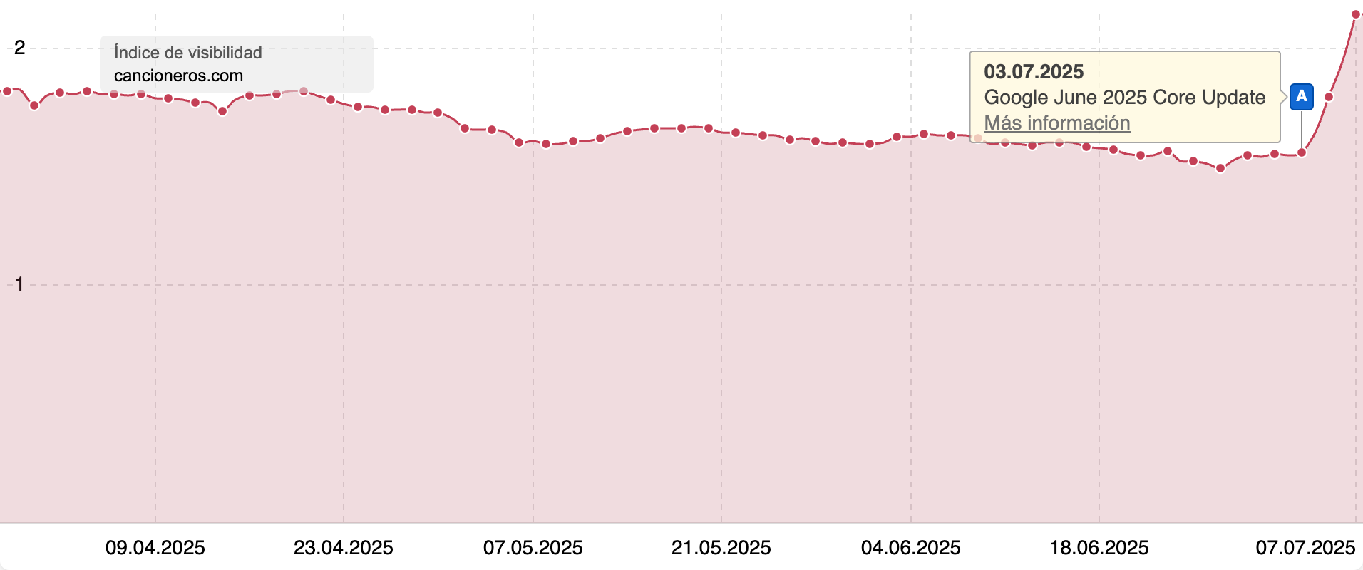Cancioneros.com también se ve beneficiado por esta actualización, con un incremento de visibilidad del +39,08%. Su Índice de Visibilidad ha pasado de 1,540 a 2,142 puntos tras el inicio del despliegue.