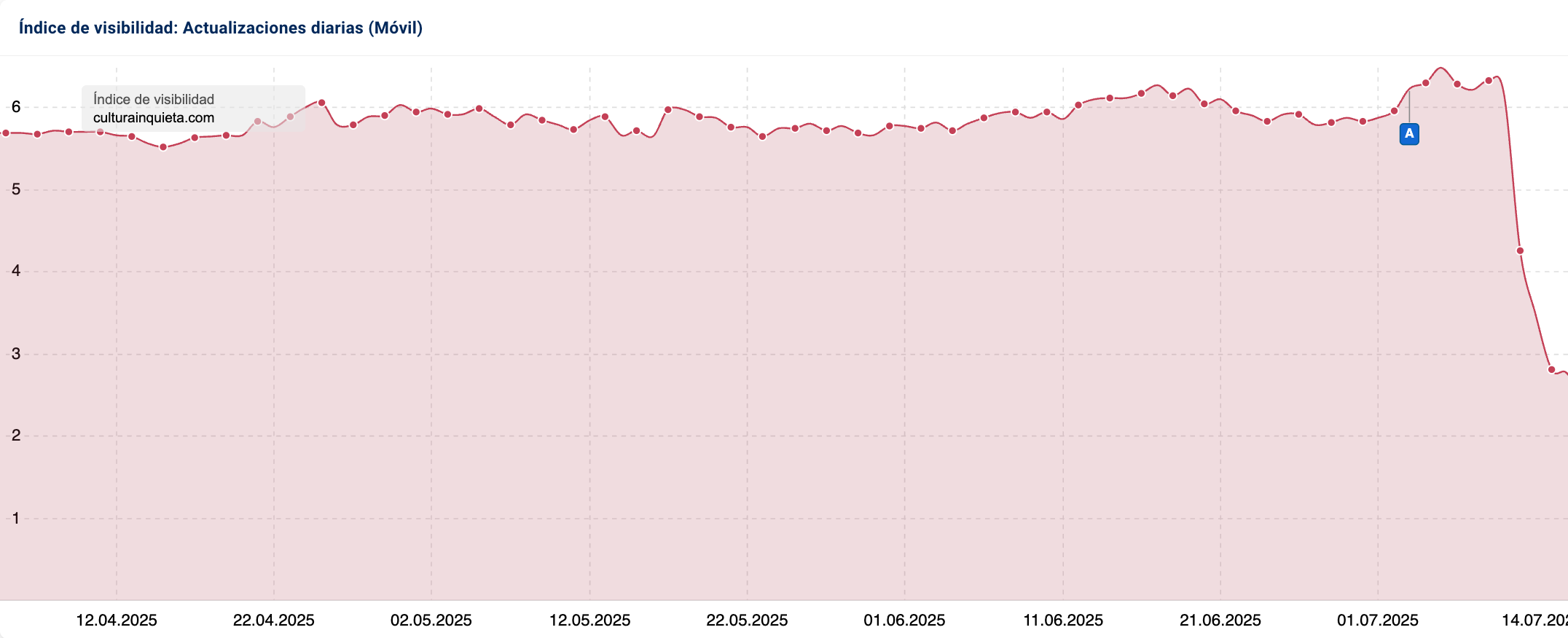 En los últimos días, el dominio culturainquieta.com ha experimentado una bajada notable en su Índice de Visibilidad, pasando de más de 6 puntos a 2,383. La caída comenzó a principios de julio y ya acumula más de -60 % de pérdida. Habrá que observar si se trata de un ajuste puntual o de una tendencia sostenida. En cualquier caso, es un cambio relevante para un medio digital con trayectoria consolidada.