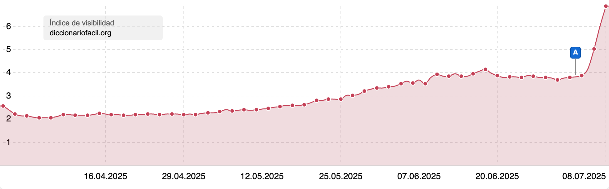 Uno de los dominios que ha ganado visibilidad con esta actualización es diccionariofacil.org, que ha pasado de 3,693 a 5,971 puntos en el Índice de Visibilidad: un incremento de +2,278 puntos (+61,69%).