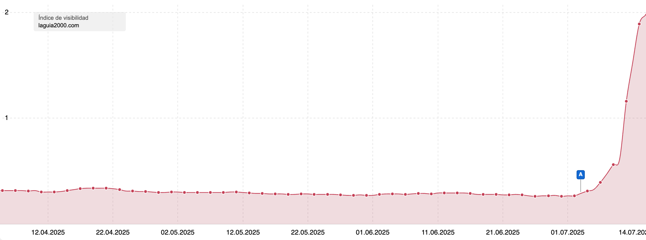 Otro caso interesante es el de laguia2000.com, que ha ganado visibilidad de forma rápida desde principios de julio. Pasa de menos de 0,3 a superar los 2 puntos, un aumento muy significativo. Este tipo de cambios suelen coincidir con mejoras técnicas, editoriales o estructurales, aunque todavía es pronto para establecer causas concretas.