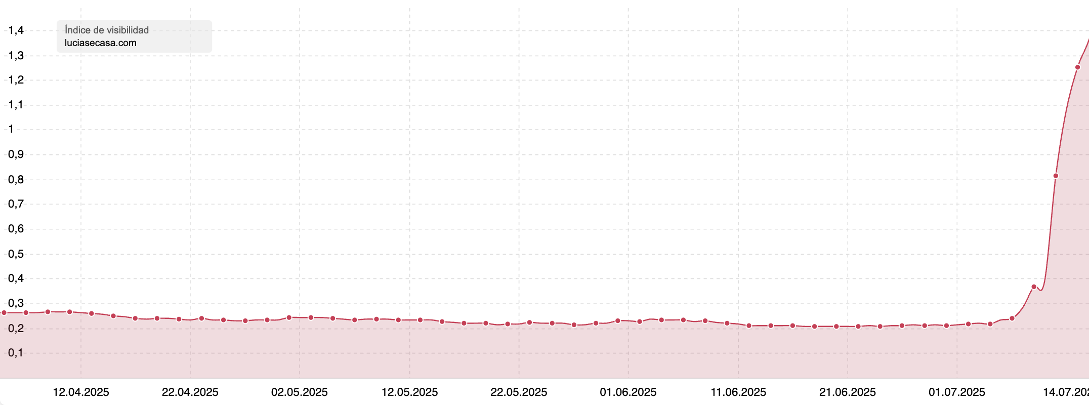 El portal luciasecasa.com ha registrado un crecimiento muy pronunciado desde finales de junio. Su visibilidad ha pasado de valores cercanos a 0,2 a más de 1,4, lo que supone una mejora destacada en poco más de dos semanas. El dominio ya muestra una tendencia claramente ascendente y será interesante seguir su evolución.