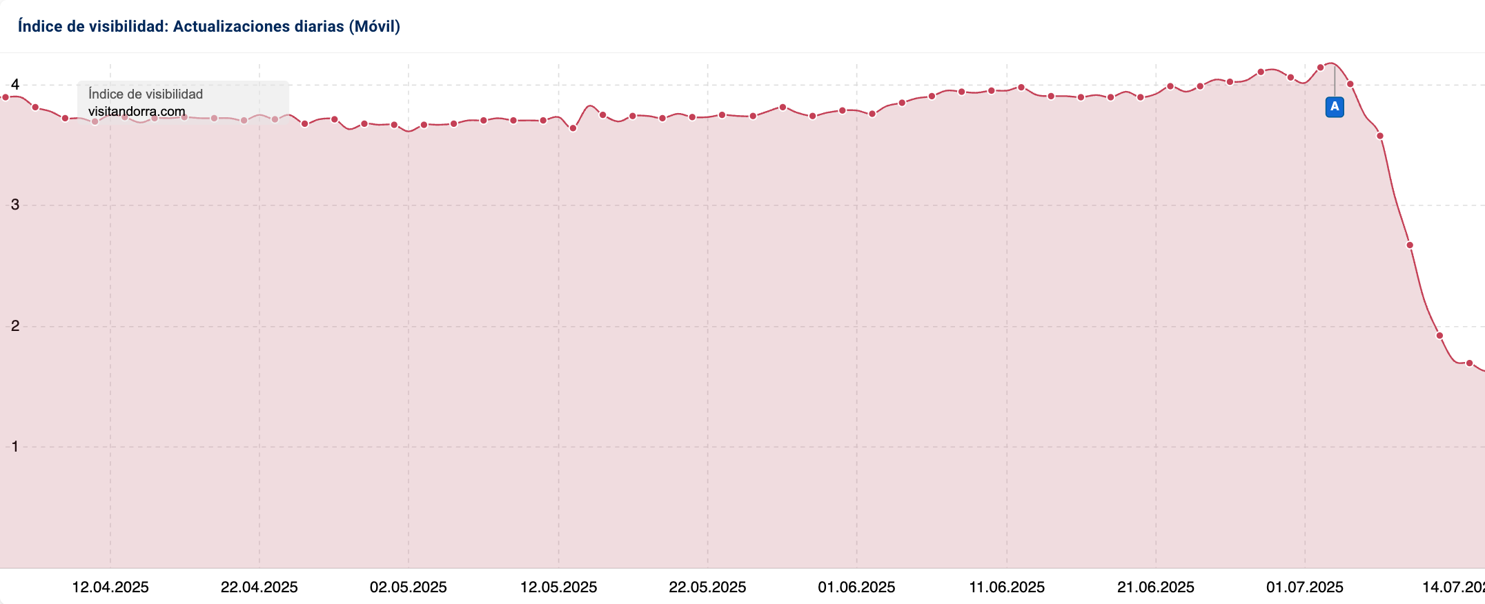 También hemos detectado un cambio relevante en visitandorra.com, que ha pasado de una visibilidad cercana a 4 puntos a 1,636. El descenso comenzó en los primeros días de julio y se ha mantenido estable en las últimas jornadas. Conviene analizar si este patrón se repite en otros portales turísticos o si se trata de un caso aislado.