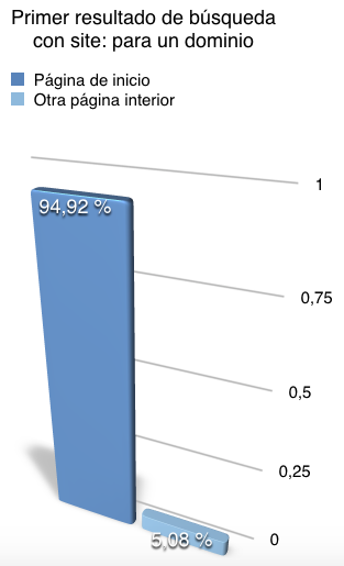 Para observar la frecuencia con la que se da este caso, he realizado una búsqueda con el operador „site:“ de 10.000 Dominios y así verificar si la página de inicio u otra página interior de un Dominio se posiciona en primer lugar: