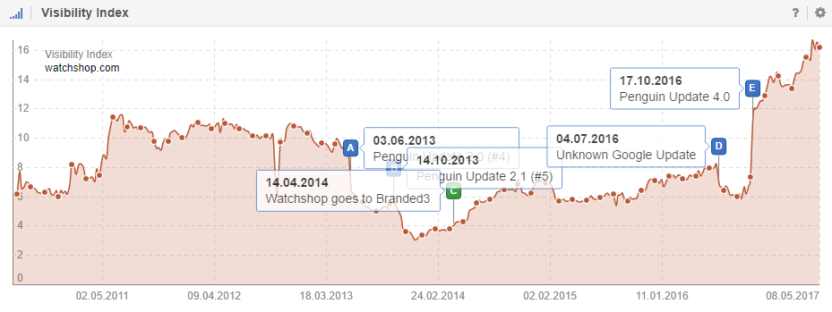 Cuando publicamos el artículo sobre los ganadores de Penguin 4.0 en octubre 2016, uno de los dominios que más llamó la atención fue Watchshop.com. Hace ya casi 4 años, en mayo 2013, este dominio cayó en el filtro Penguin 2.0 (perdiendo un 40% de su visibilidad).