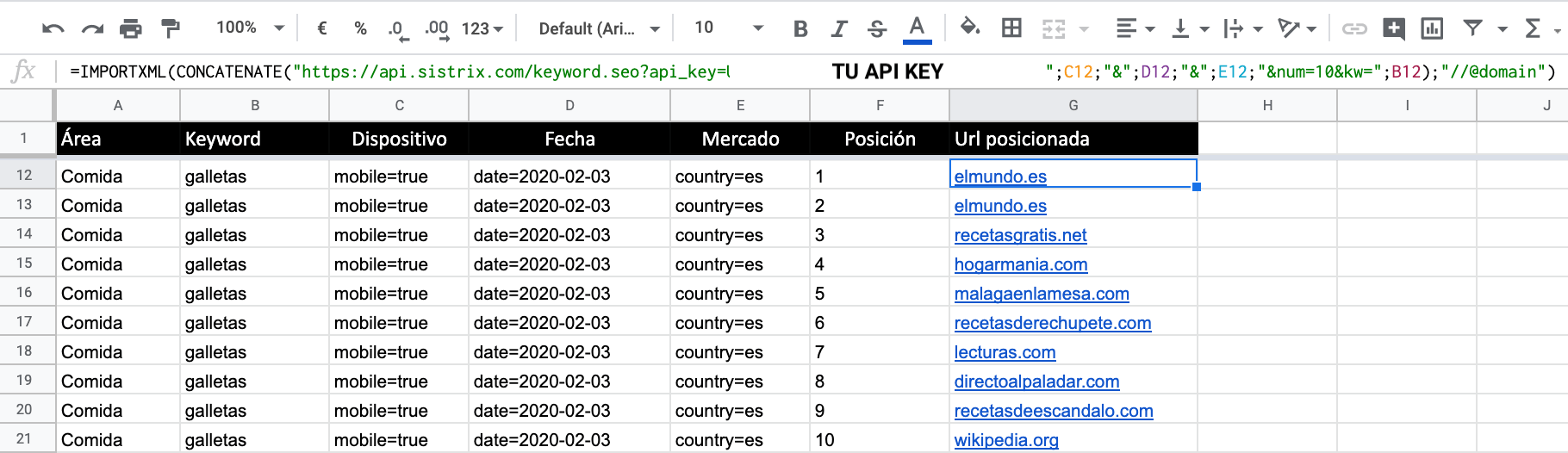 =importXML=("https://api.sistrix.com/keyword.seo?api_key=AQUI-VA-TU-API-KEY&mobile=true&date=2020-02-03&country=es&num=10&kw=galletas"; "//@domain")Una posible idea para extraerlo es construyendo una tabla en Spreadhseet y usando el valor dominio o URL. De esta forma, puedes automatizar la extracción, obtener los datos a gran escala sin tener que usar el valor posición y sobre todo, tener todos los datos en una misma tabla para poder trabajar con ella.