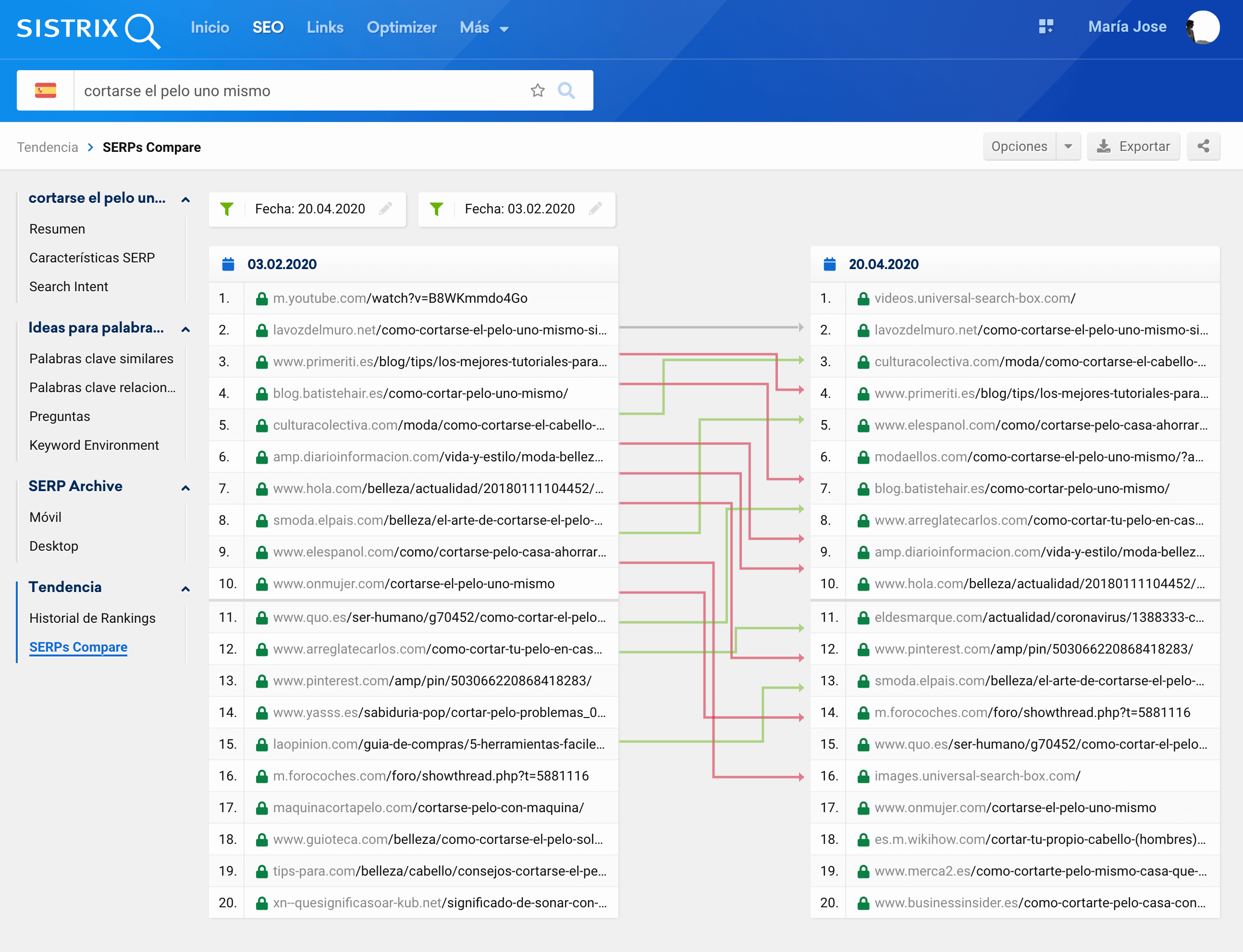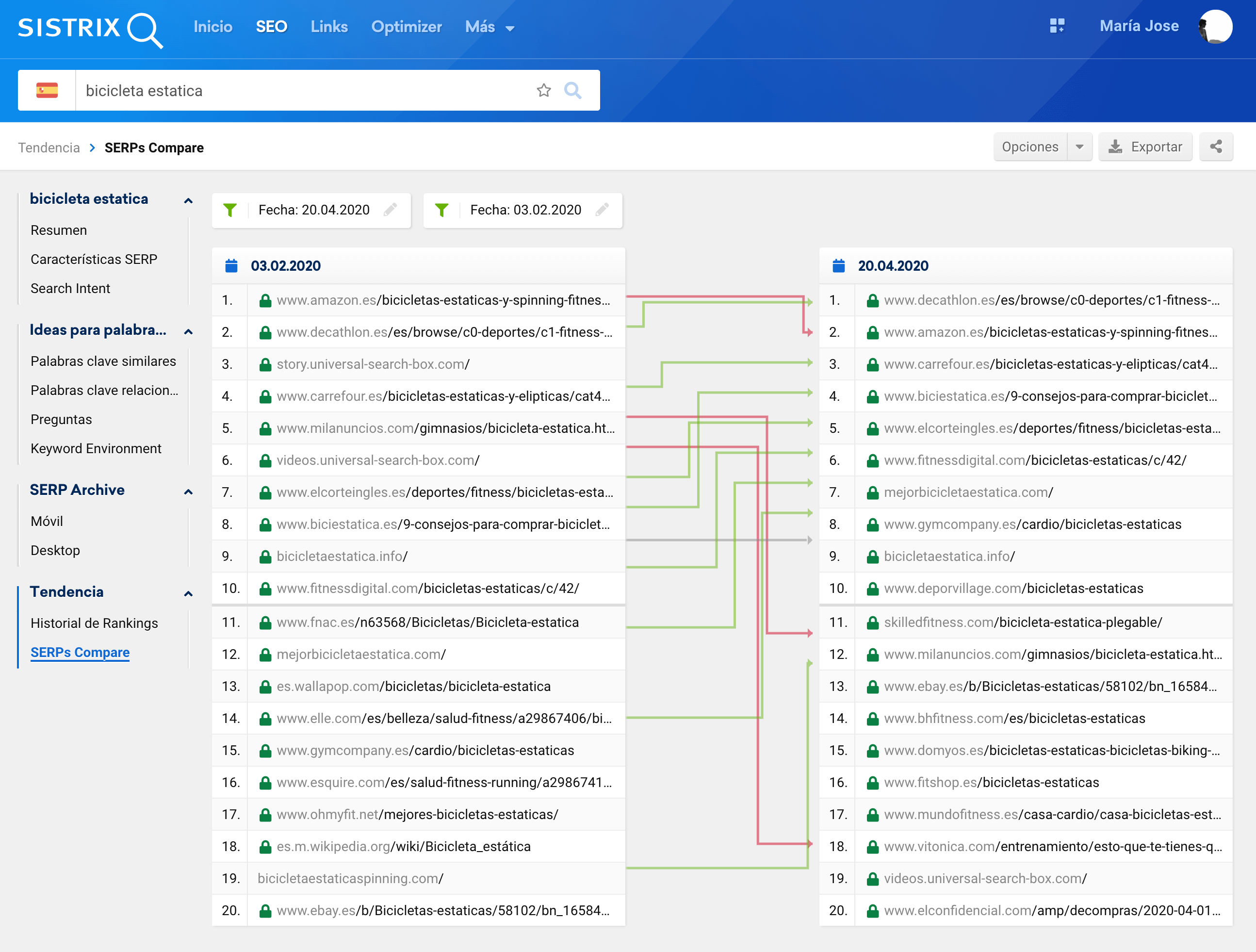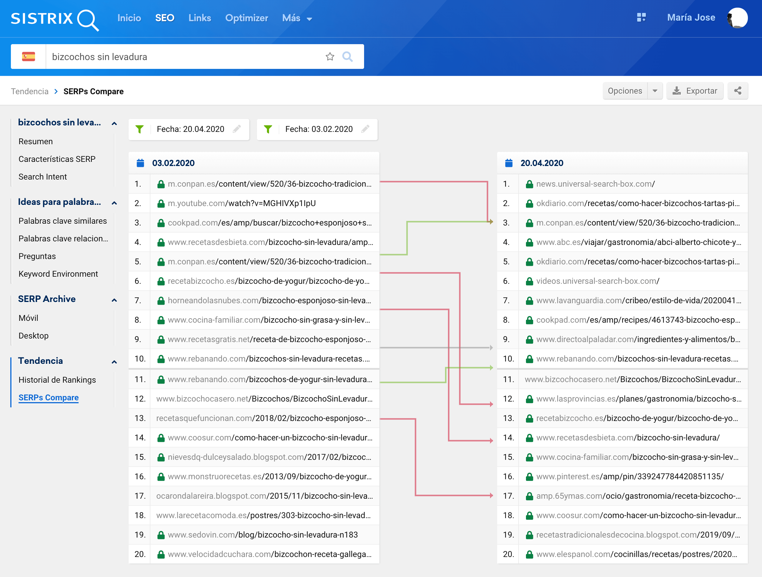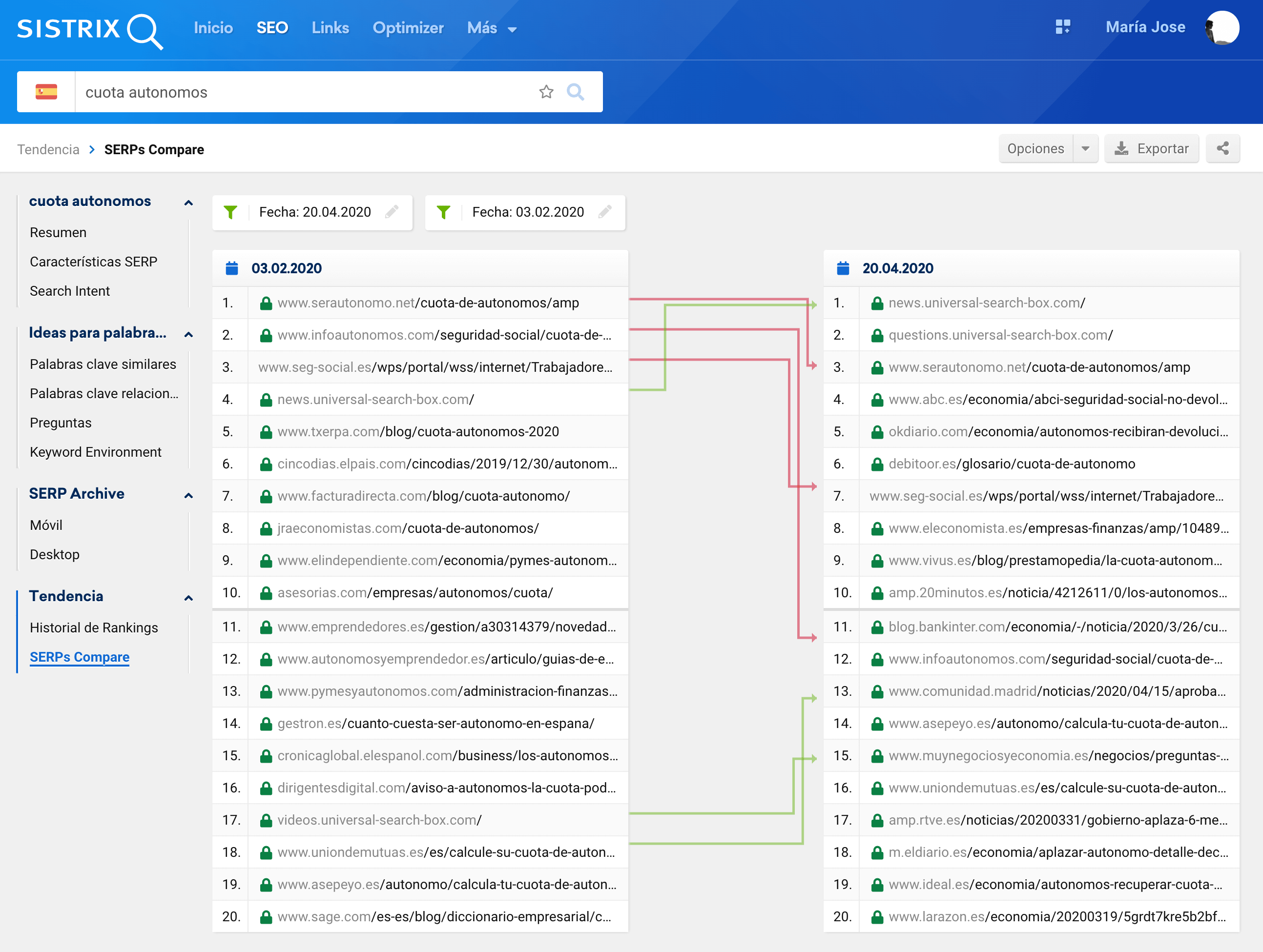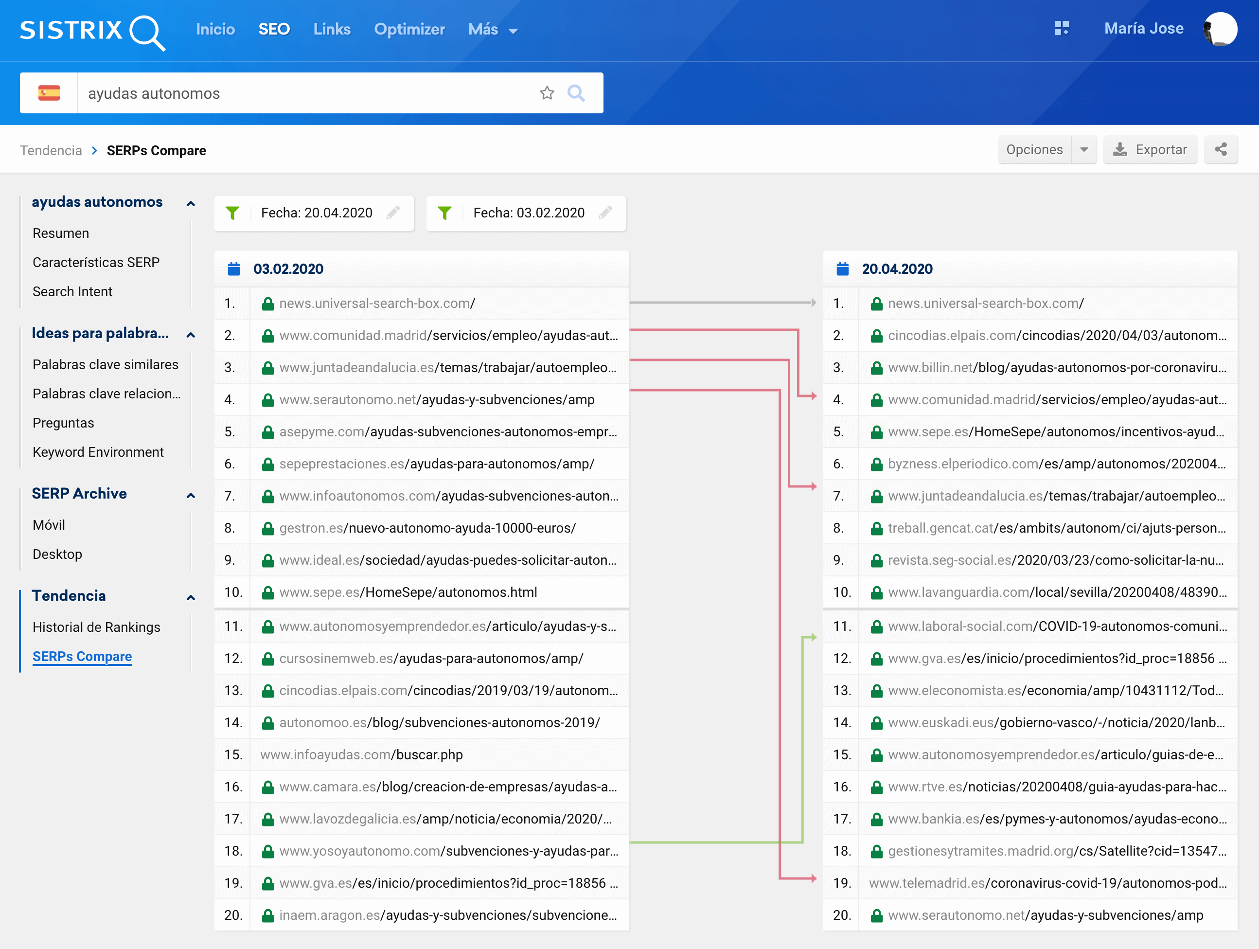 Utiliza la función «Comparar SERPs» para obtener una comparación gráfica del top 20 de una misma palabra clave en dos fechas diferentes: