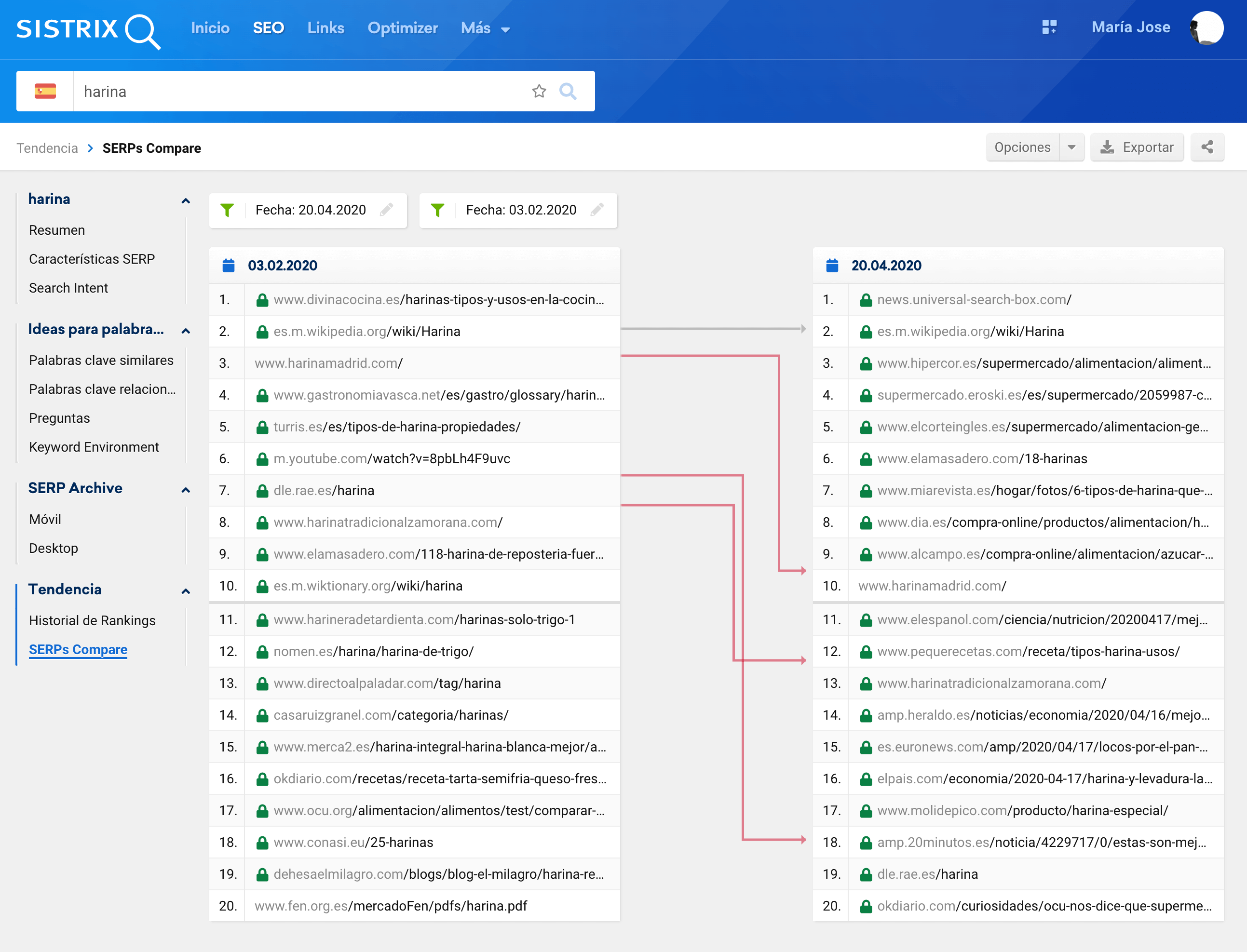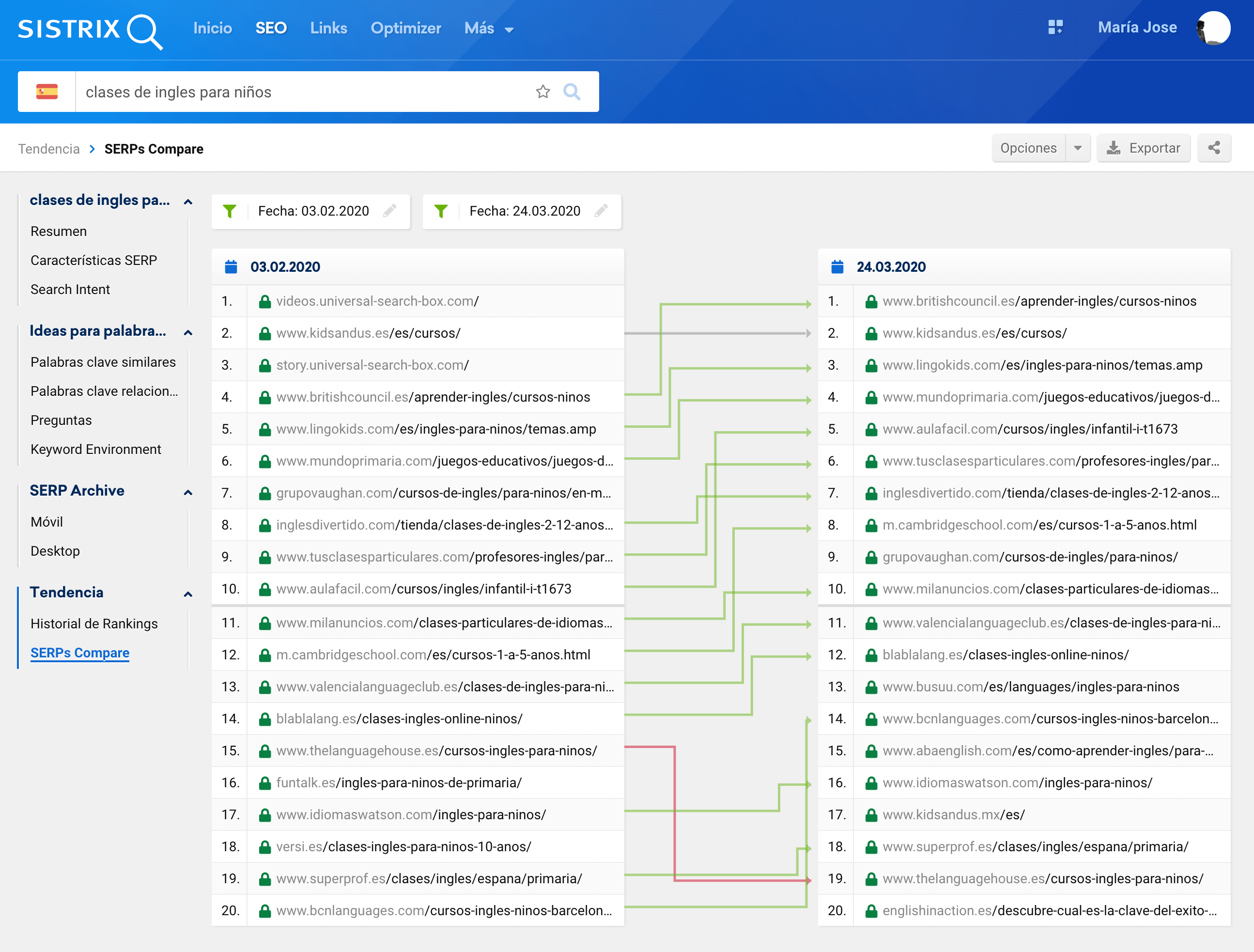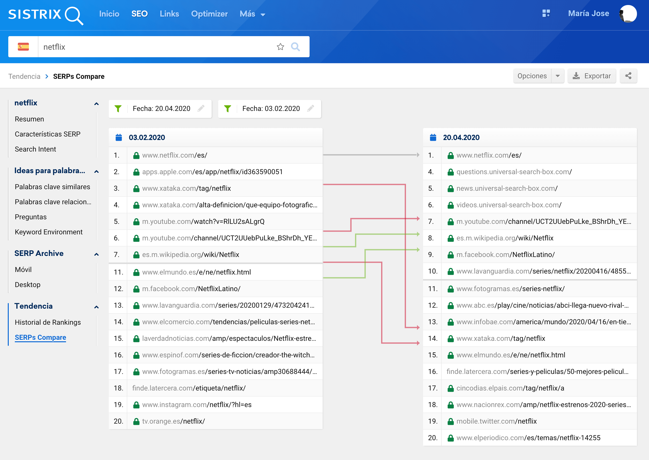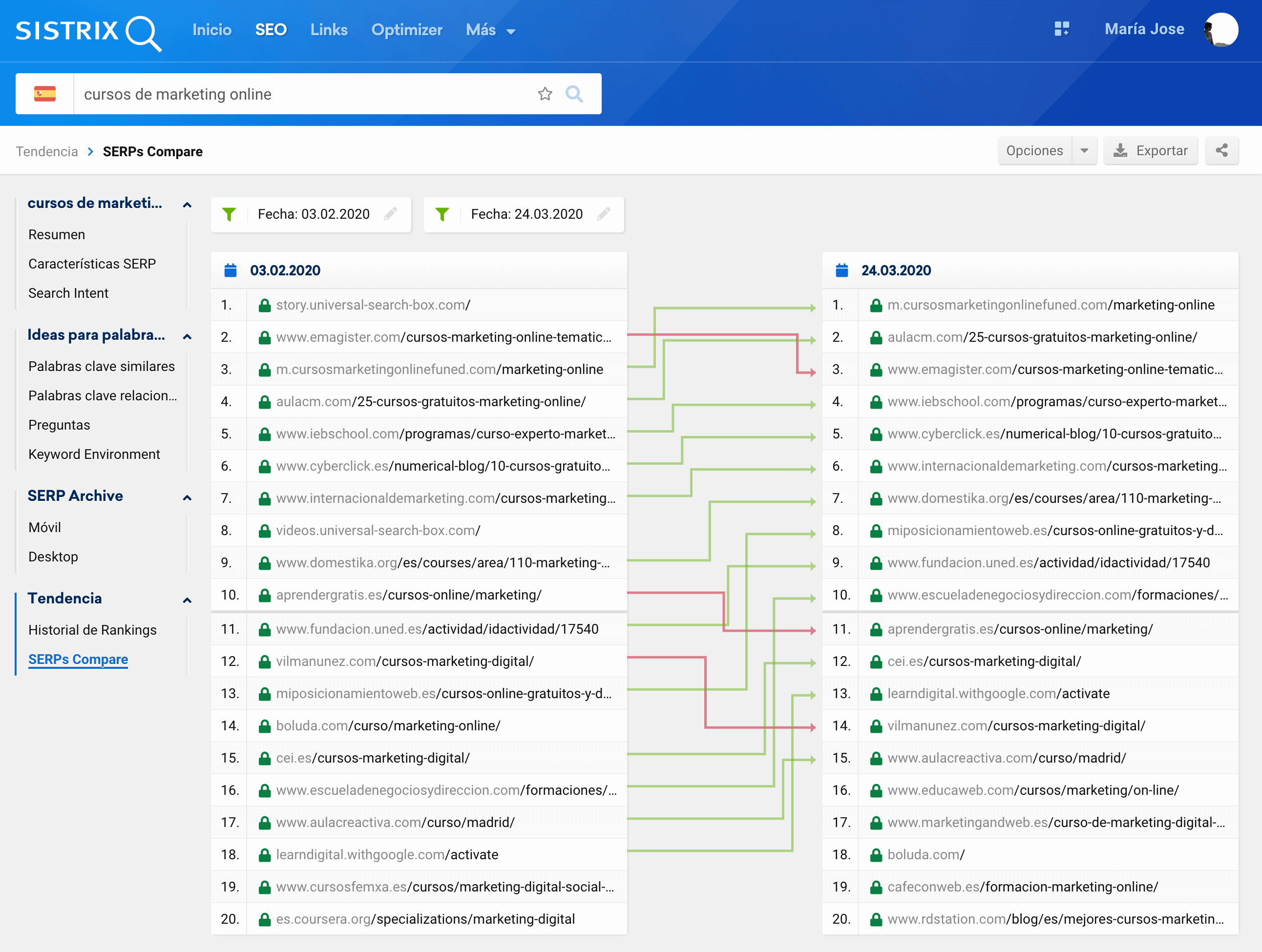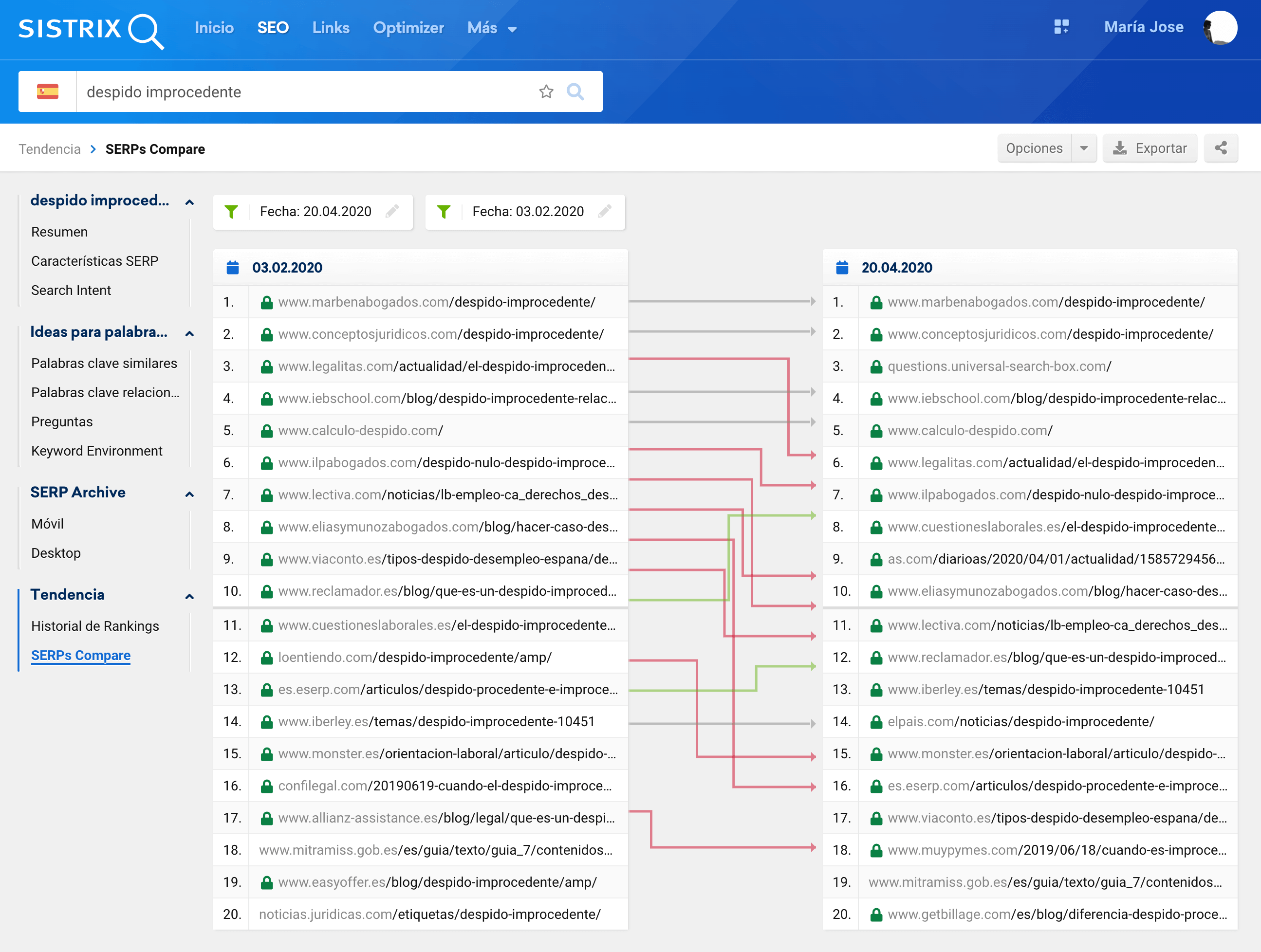 Utiliza la función «Comparar SERPs» para obtener una comparación gráfica del top 20 de una misma palabra clave en dos fechas diferentes: