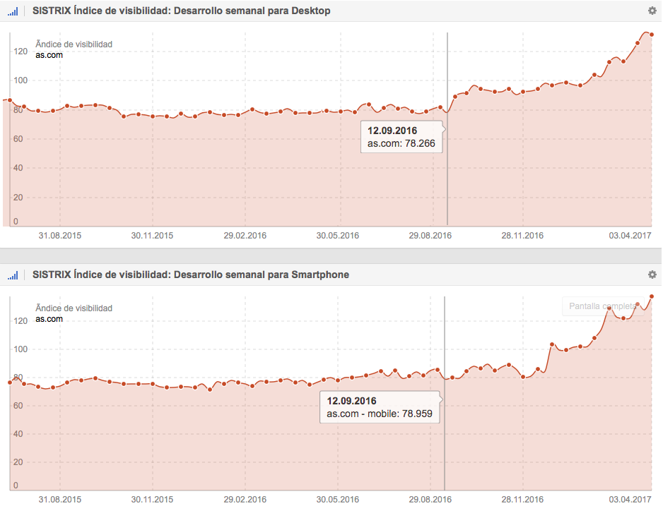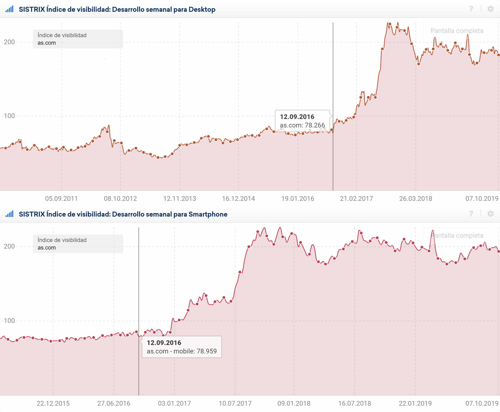 Y el plan ha funcionado. El AS.com ha pasado de tener 78 puntos de visibilidad en Desktop a tener 131, y en Smartphone ha pasado de tener 79 puntos de visibilidad a 137, como se puede apreciar en las gráficas: