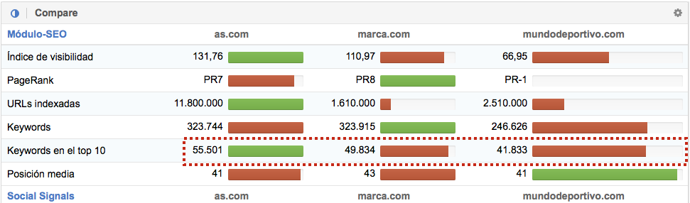 Si comparamos el número de palabras claves que poseían los 3 diarios deportivos más importantes en Google.es, antes y después del crecimiento del AS.com, podremos observar que los 3 diarios han aumentado el número de términos con los cuales se posicionan en Google, pero el AS.com, posee más y mejores posiciones en primera página: