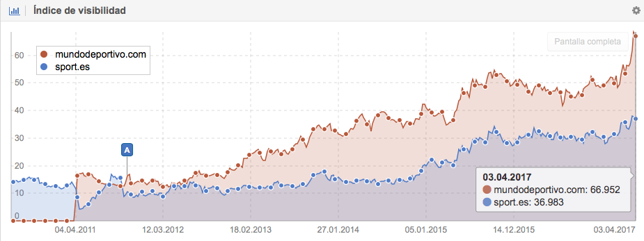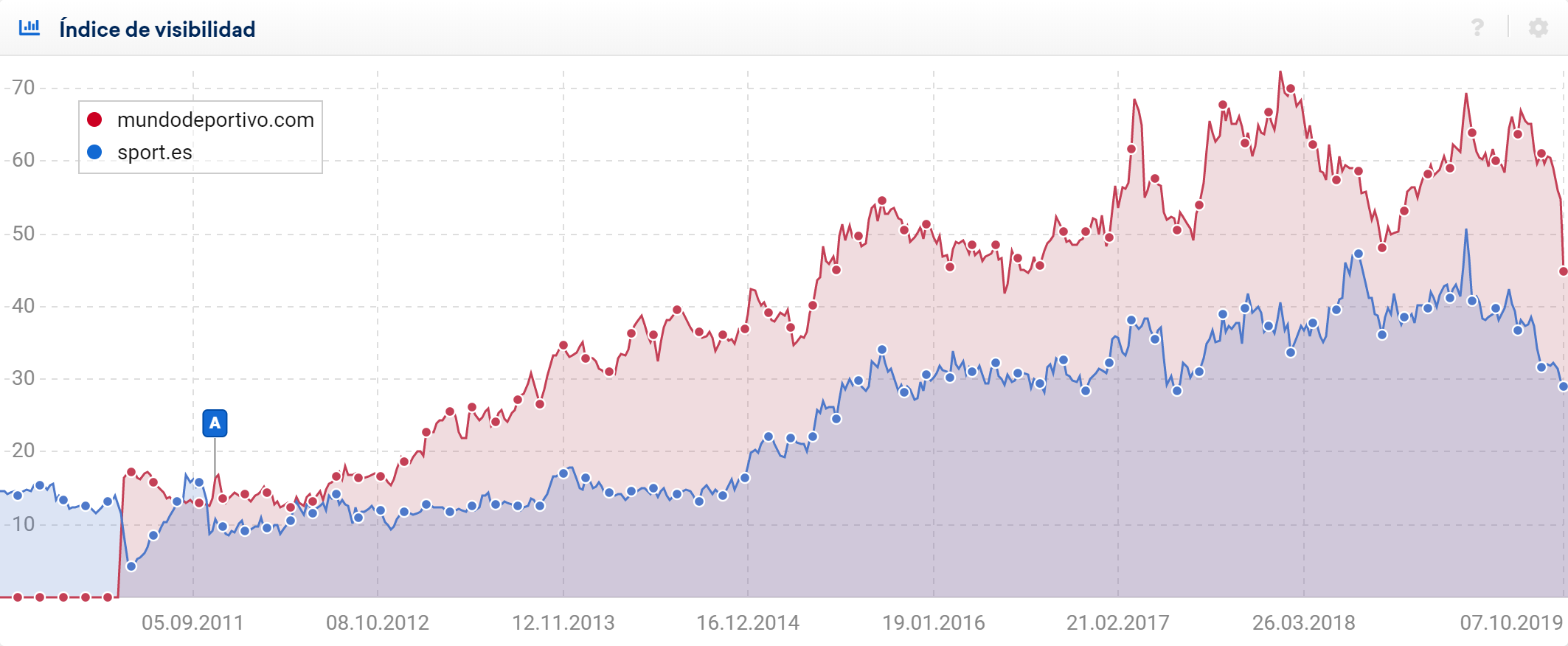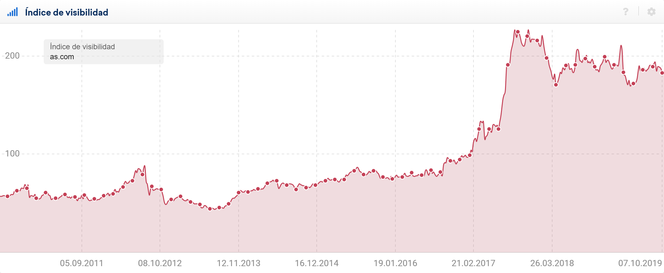 Las medidas SEO adoptadas por el AS.com, le han permitido ampliar su oferta informativa, posicionar bien esta información, y así, captar el tráfico acertado desde Google. A través del indice de visibilidad, SISTRIX nos muestra el desarrollo del dominio, su posición dentro del mercado de búsqueda, si su estrategia SEO funciona o no, como también, si Google en base a la respuesta del consumidor, le otorga más cuota de mercado o no.
