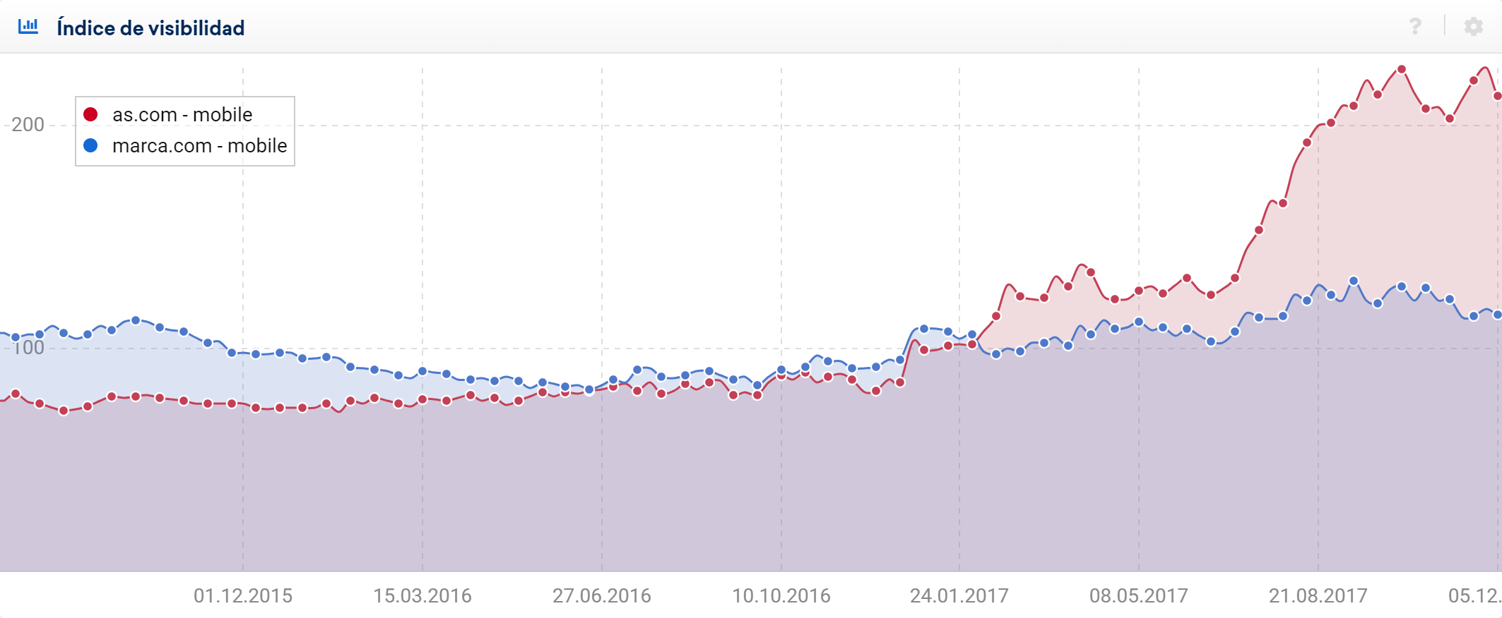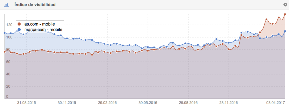 Sin embargo, desde enero 2017, la versión digital de el AS.com ha superado al MARCA.com en Google y con ello, el AS.com es ahora el diario deportivo más visible en Google.es, superando al MARCA.com con un 20% más de visibilidad para móviles y un 16% más para Desktops: