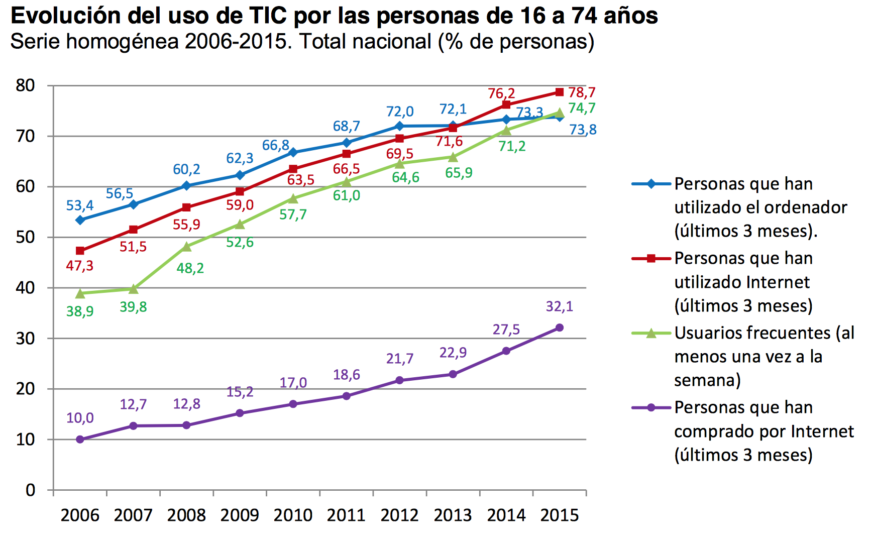 «En cuanto al uso de Internet, más de 27,1 millones de personas, el 78,7% de la población de 16 a 74 años, ha utilizado Internet en los tres últimos meses. Esta cifra supera en 2,5 puntos la del año anterior… La utilización de smartphones para conectarse a Internet se acentúa respecto al año anterior, con un aumento de su uso de 5,9 puntos.» Es decir, más de 860.000 internautas nuevos en España de un año a otro y casi 1.6 millones de internautas nuevos que usan su móvil para navegar.