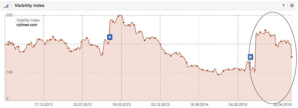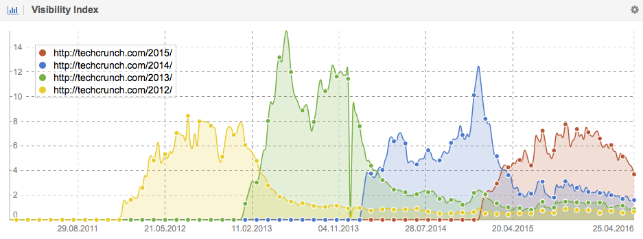 El resultado de tratar la información como lo hacen hasta el momento, se ve claramente en esta gráfica. Todo el duro trabajo de investigación y redacción de artículos durante un año desaparece de Google con el paso tiempo:
