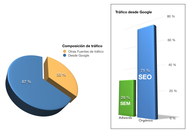 El estudio de FLAT101 divide las fuentes de tráfico en orgánico, adwords, directo, email y referal. Lo primero que salta a la vista es que el 66,55% del tráfico en los e-commerce estudiados, proviene de Google. ¡Un 66%! No es de extrañar que muchas empresas después de probar Google, no deseen vivir sin él. Es muy probable que esa cifra sea aún mucho más elevada para marcas desconocidas. En todo caso, esta cifra no sólo refleja la importancia del buscador hoy en día, sino que también refleja la importancia del SEO, pues el 71% de todo ese tráfico proveniente de Google es tráfico SEO: