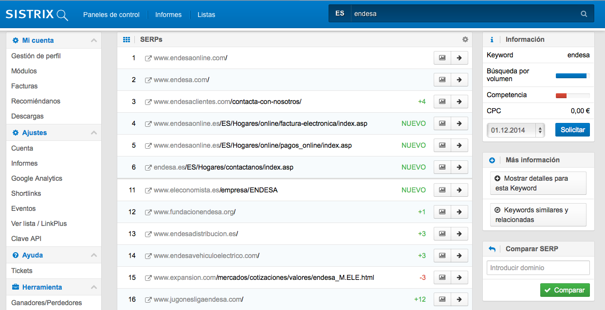 Un comportamiento de este tipo indica con mucha frecuencia que existe -como mínimo- un contenido duplicado externo, es decir, otro Dominio con el mismo contenido o con un contenido casi idéntico. Por esta razón Google se despista y no sabe que Dominio enseñar en los resultados de búsqueda. Hechando un vistazo a el top 100 para la Keyword “endesa“ en nuestra herramienta SISTRIX, se pueden descubrir muchos Dominos sospechosos que puedan estar generando el conflicto del contenido duplicado (introducid la keyword «endesa» en el campo de búsqueda).