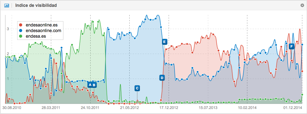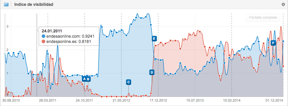 Si volvemos a la gráfica del indice de visibilidad de endesaonline.es y nos vamos a la “rueda de ajustes“ de la esquina superior derecha, encontraremos la opción “Comparar datos en el gáfico“. Si añadimos el dominio endesaonline.com para comparar ambos dominios, descubriremos un cambio de posiciones bastante animado.