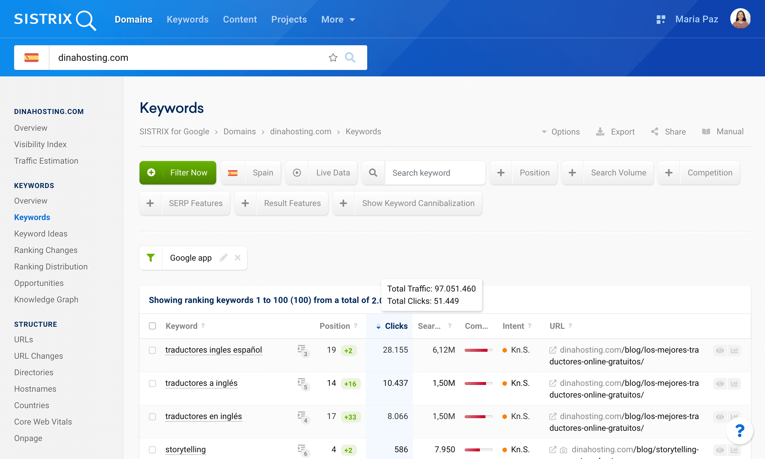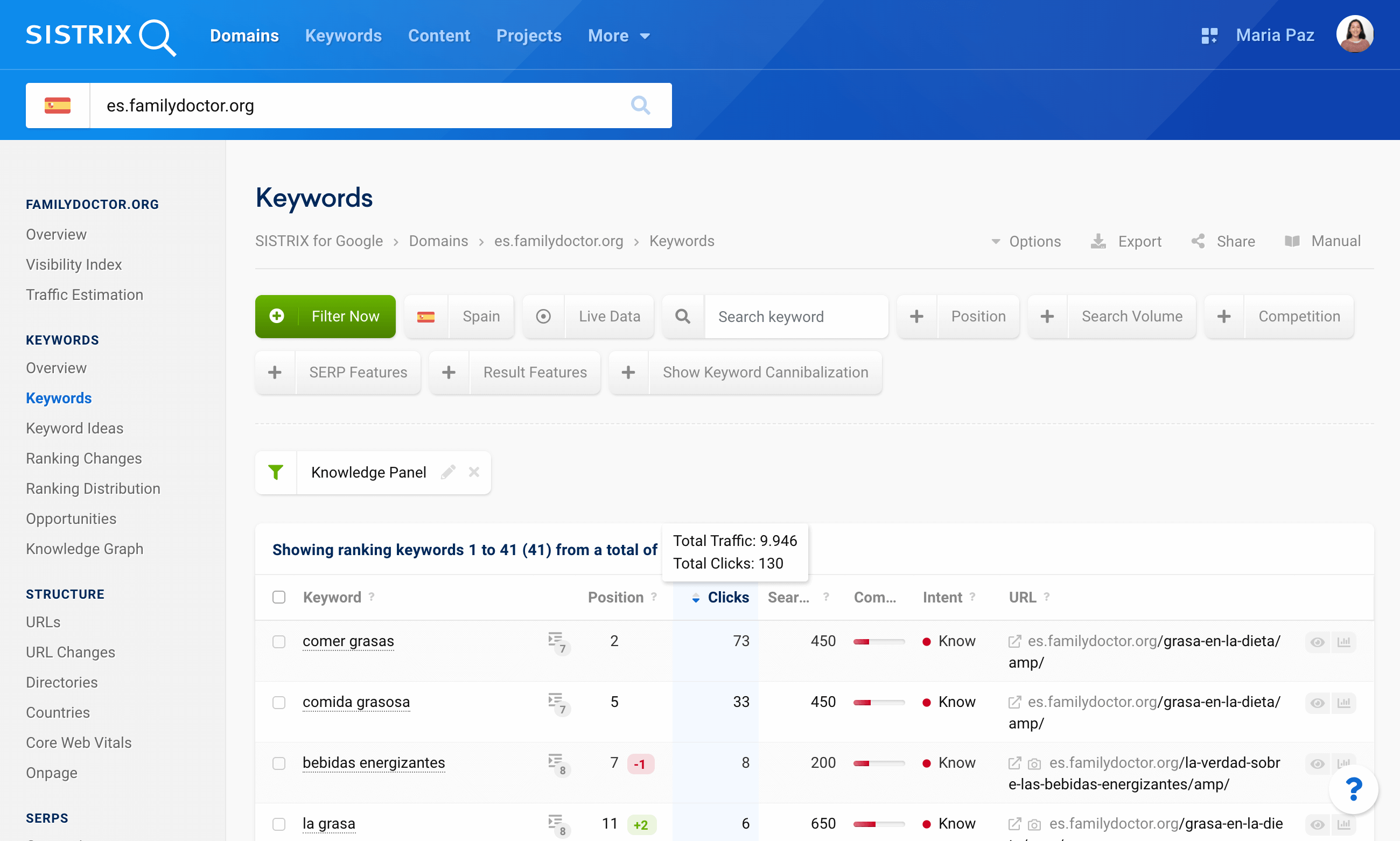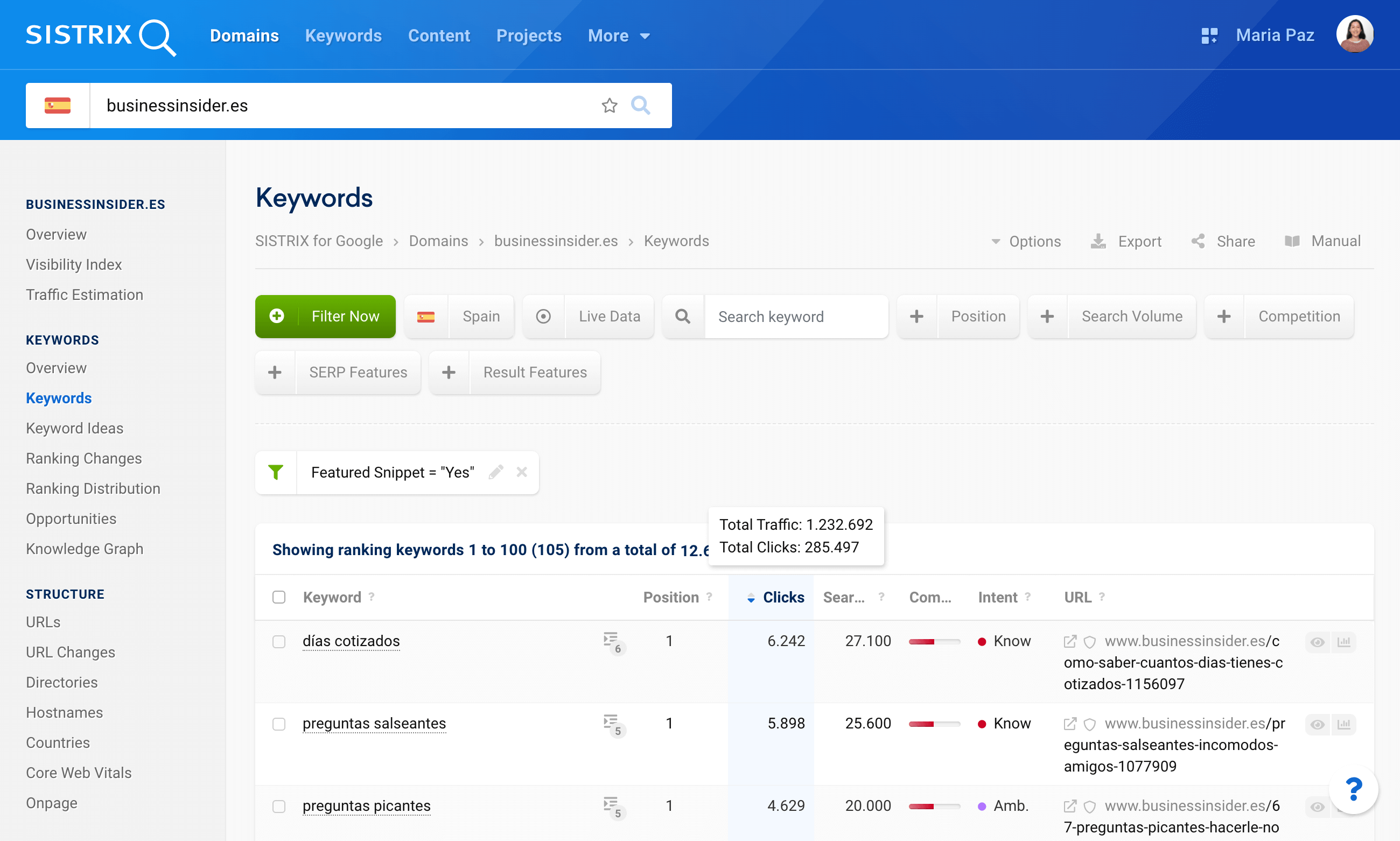 En SISTRIX ya se pueden filtrar fácilmente las características SERP correspondientes y las características de los aciertos. Si pasas el ratón por encima del número total de palabras clave posicionadas, ahora también mostramos la suma del volumen de búsquedas y clics de las palabras clave filtradas, lo que te permite analizar rápida y fácilmente el riesgo de cada dominio.