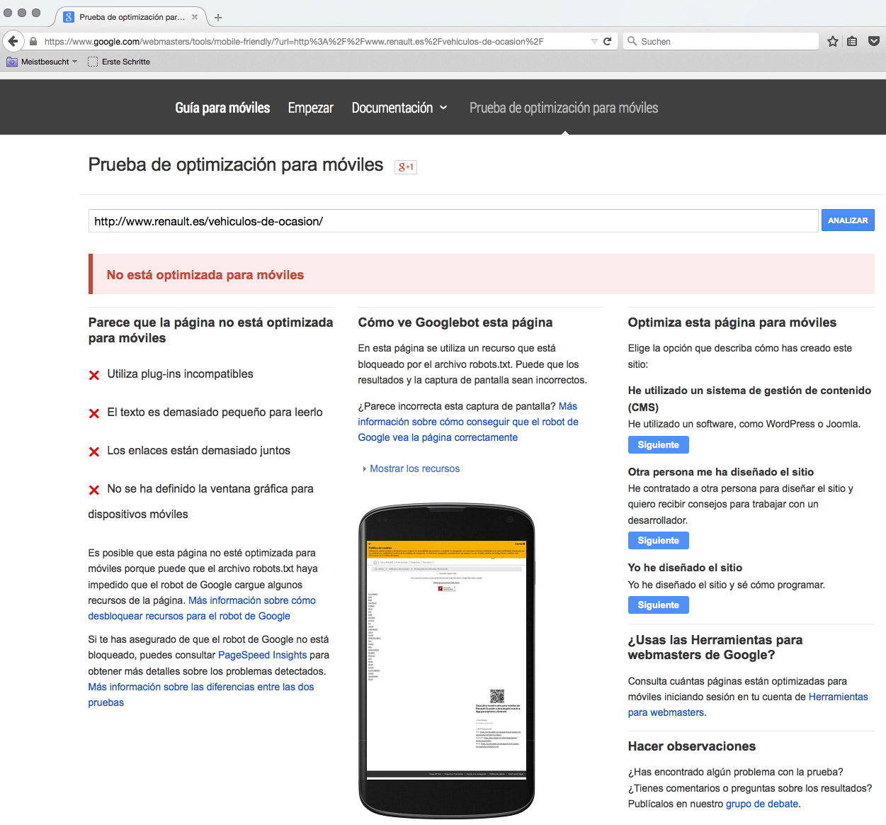 A pesar de que renault.es tiene algunas URLs optimizadas para smartphone, tiene otras URLs también importantes que aún no lo están. Renault se posiciona en el top-10 para la palabra clave «vehículos de ocasión» en la versión Desktop, sin embargo no se posiciona para móvil. La URL para esta palabra clave renault.es/vehiculos-de-ocasion/, usa flash, y con ello no está optimizada para móviles: