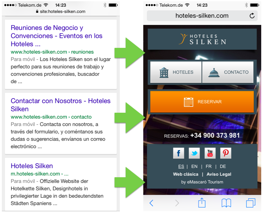 En el siguiente ejemplo de hoteles-silken.com (-56%), todos los resultados de búsqueda en Google redirigen a la página de inicio de la versión móvil del dominio: