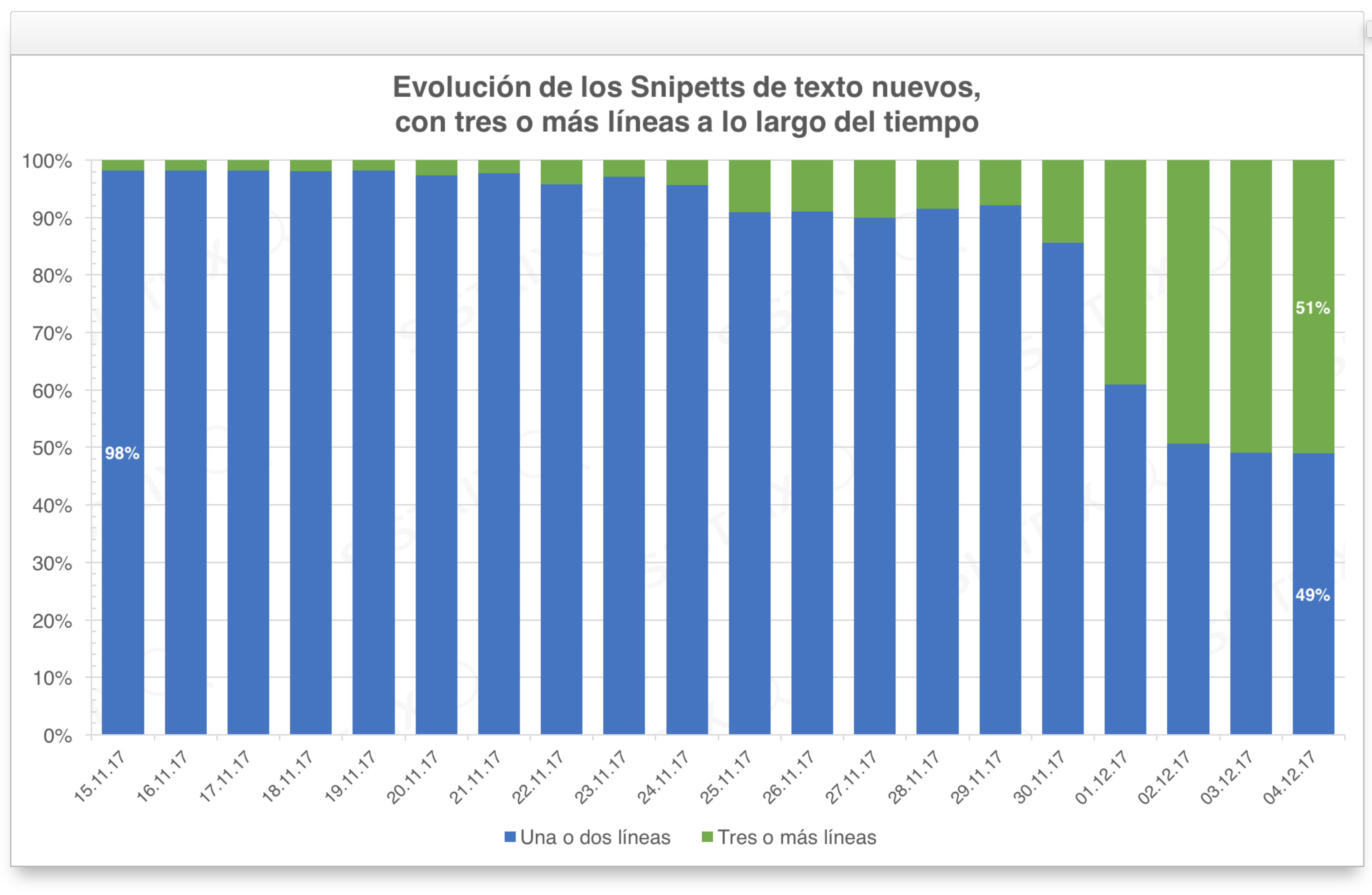 Para verificar en qué medida se ha extendido este cambio en los SERP, hemos analizado el número de líneas de Snippet de texto desde mediados de noviembre y resumido en este diagrama: