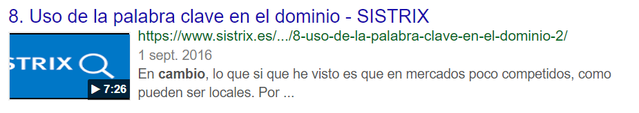 Hasta ahora, los resultados de vídeo competían con resultados orgánicos «normales» en las SERP, pero se destacaban con una pequeña miniatura: