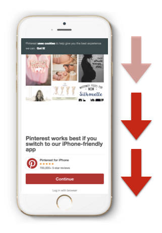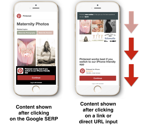 Esta perdida ha sucedido justo una semana después de que Google lanzará su actualización para combatir las intersticiales intrusivas, y como bien sabemos, Pinterest hace/hacía bastante uso de ellas. He aquí 2 ejemplos:
