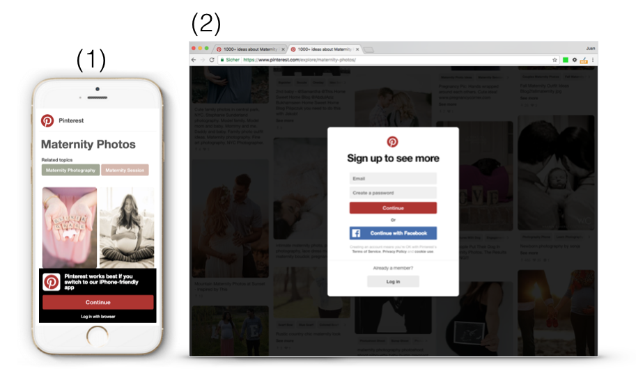 Comparativa de la misma URL de Pinterest.com para Smartphone (1) y Desktop (2)