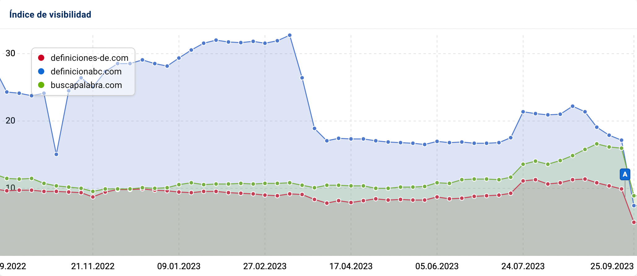 Como os comentaba al principio siempre que se toca temas de contenidos y SERPs tenemos a los mismos afectados. Definiciones, bancos de fotos… etc. En este caso los sites de definiciones afectados siguen el mismo patrón que lo visto anteriormente.
