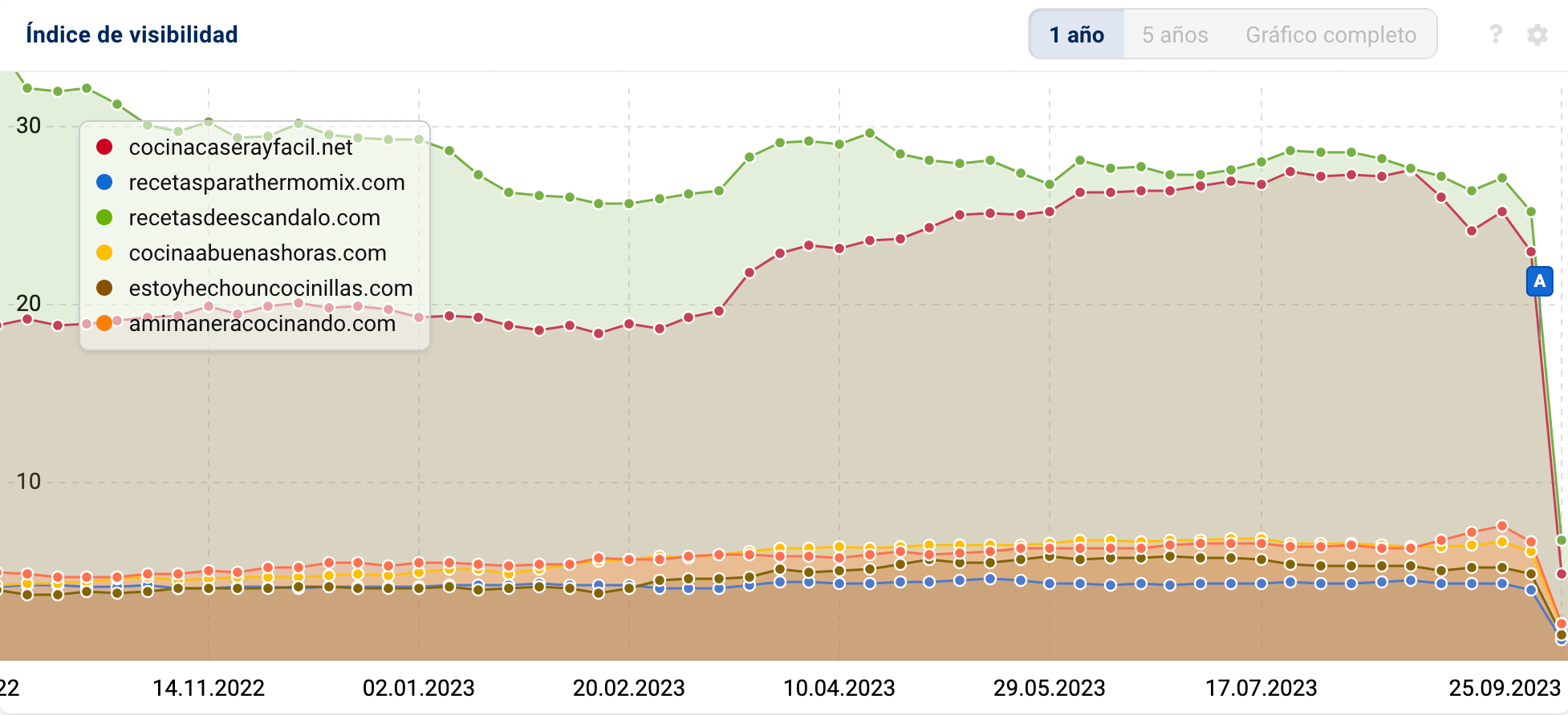 Espectacular la leche en el sector recetas con caídas del 80 y 90%. También hay que decir que es un sector fácil de evaluar por parte de Google. Hay tantos proyectos de recetas afectados que no puedo nombrar ni un 1% así que simplemente os presento las correlaciones en visibilidad y entro a analizar las posibles causas.