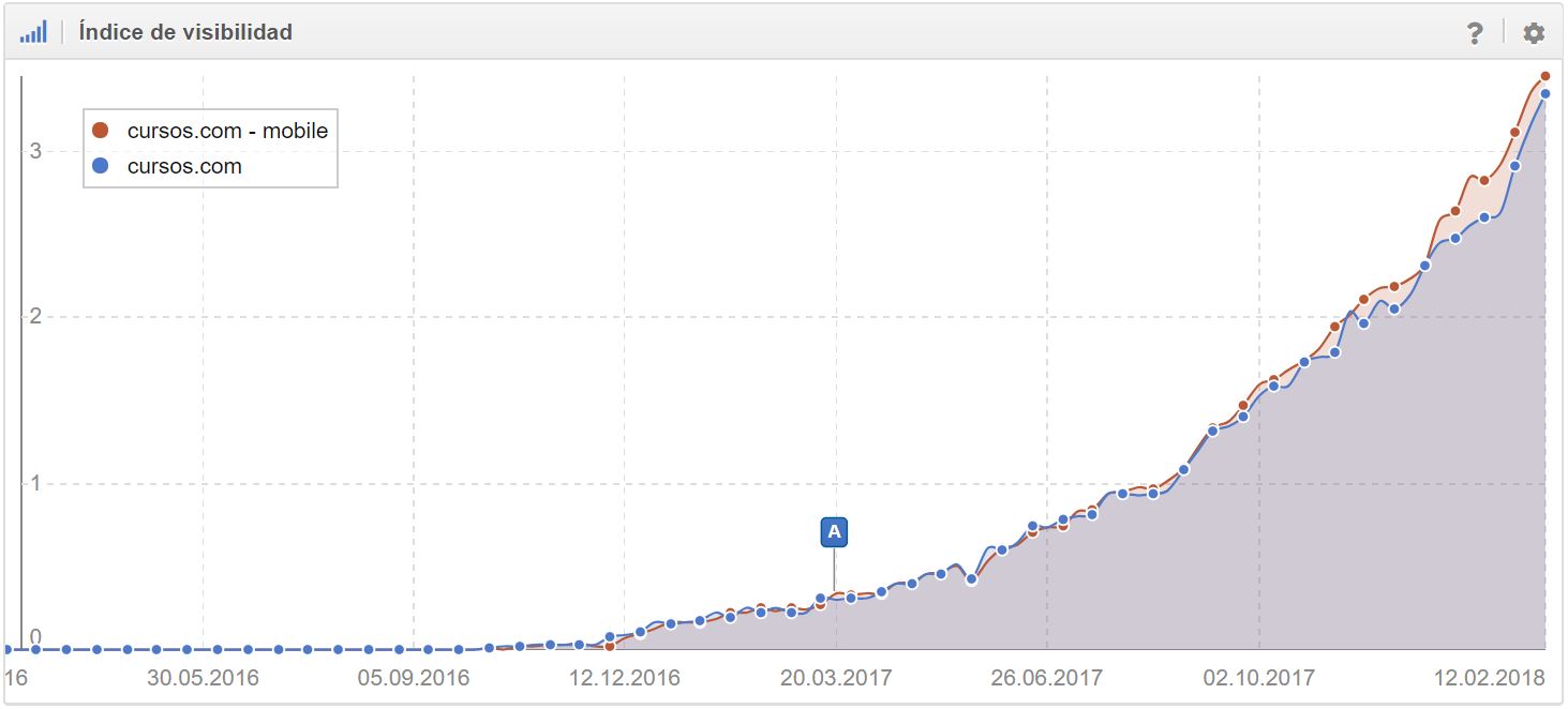 El caso de cursos.com es algo diferente. Compraron un dominio ya existente pero que no cubría las necesidades de búsqueda del usuario por lo que tuvieron que rescatarlo. Empezaron el trabajo con un Índice de visibilidad de 0,07 puntos y han conseguido llevarlo a su actual Índice de Visibilidad de 3,451 puntos, lo que supone un crecimiento del 1.495,71%. En la conversación que mantuvimos con el SEO responsable de este sitio Web, Javier Lorente, nos comentó que básicamente eliminaron todo el contenido antiguo, devolvieron 410 y eliminaron enlaces externos perniciosos. Además han deshabilitado completamente el rastreo a la parte indexador/buscador del sitio ya que es que es contenido duplicado puesto que sale en cientos de portales de contenidos de cursos. Generan contenido de calidad que aporta muchísimo valor al usuario. Además, y pensando muy bien la taxonomía, lo dividen únicamente 8 o 9 categorías.