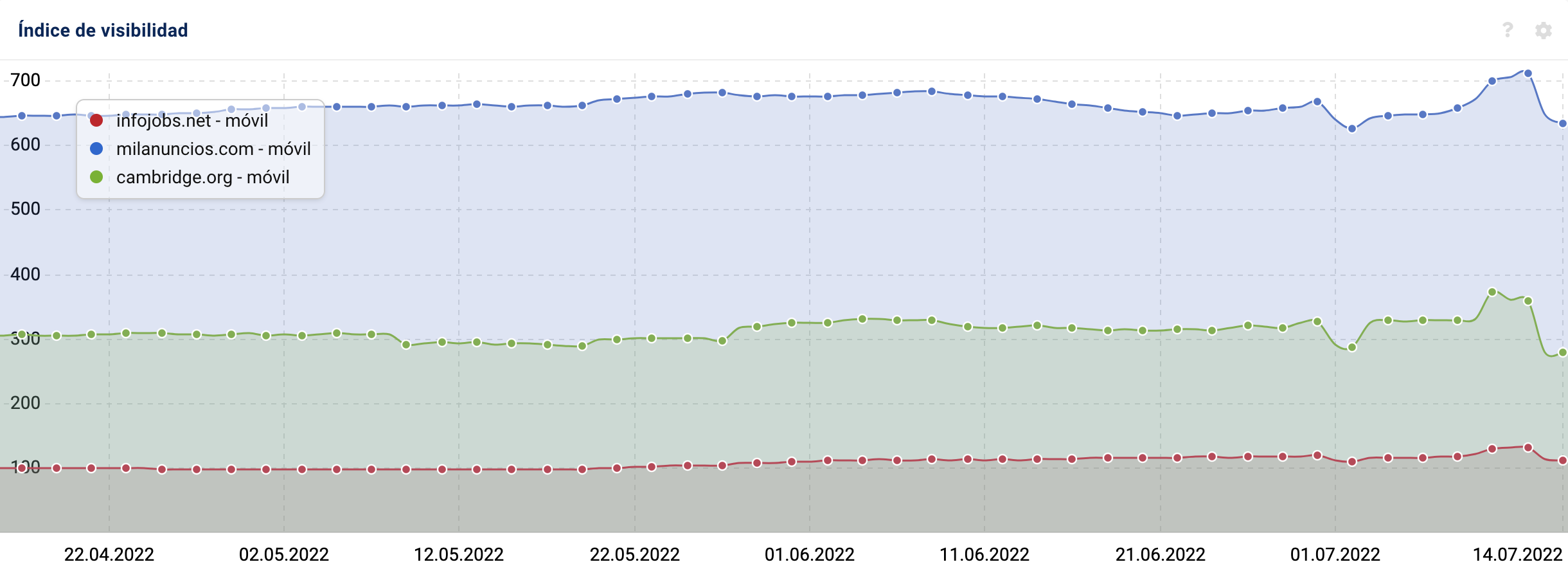 Y para que veáis que no tiene nada que ver con el sector o tipo de Query os dejo otra que compara infojobs.net, milanuncios.com y cambridge.org. Veréis el mismo patrón exacto: