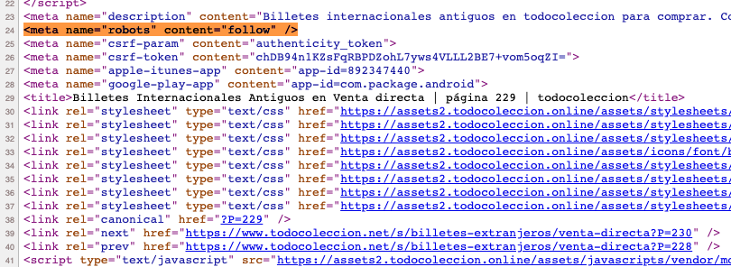 Veo que empezaron a desindexar después de la actualización, y muy acertadamente, los filtros de «Destacado», «Con descuento», «Venta directa», dejando únicamente «Subasta», lo que me dice que están reduciendo el tamaño y duplicidad del sitio. Pero la tarea no se implementó correctamente y deja indexadas todas sus paginaciones, con un robots y canonical incorrectos XD