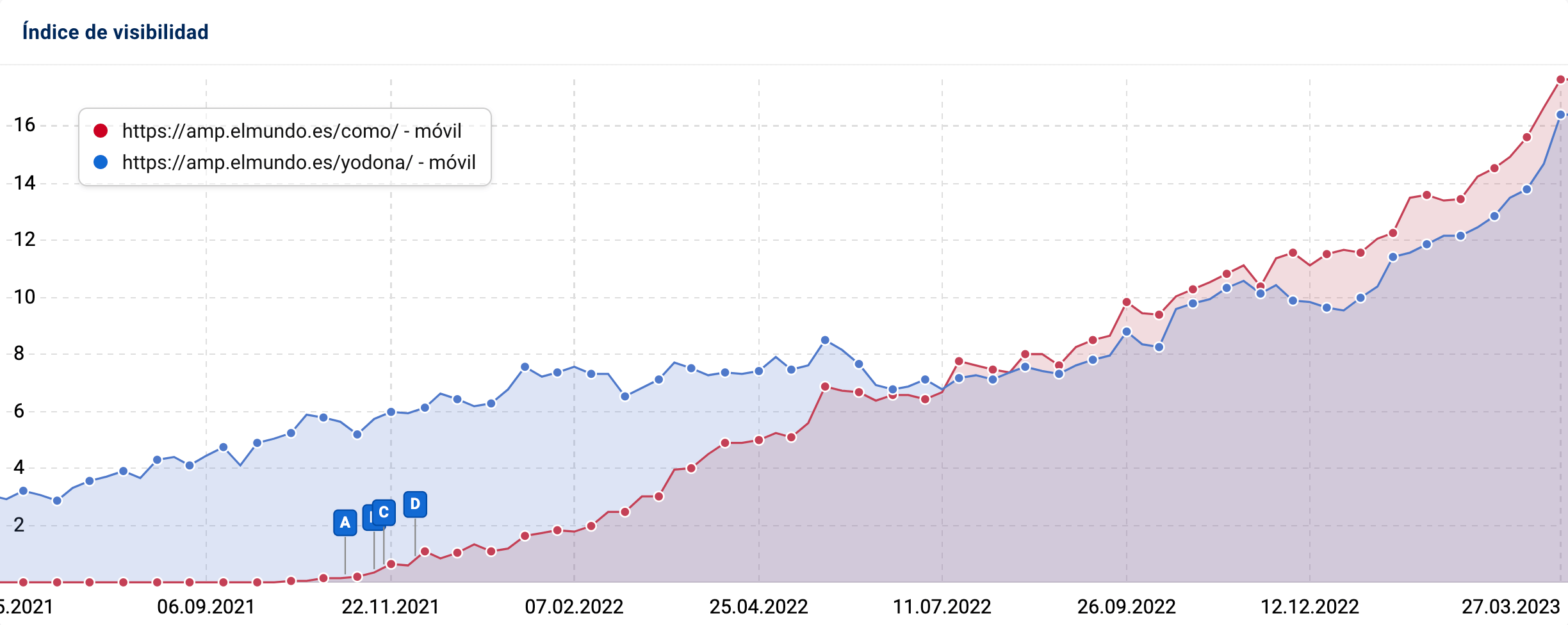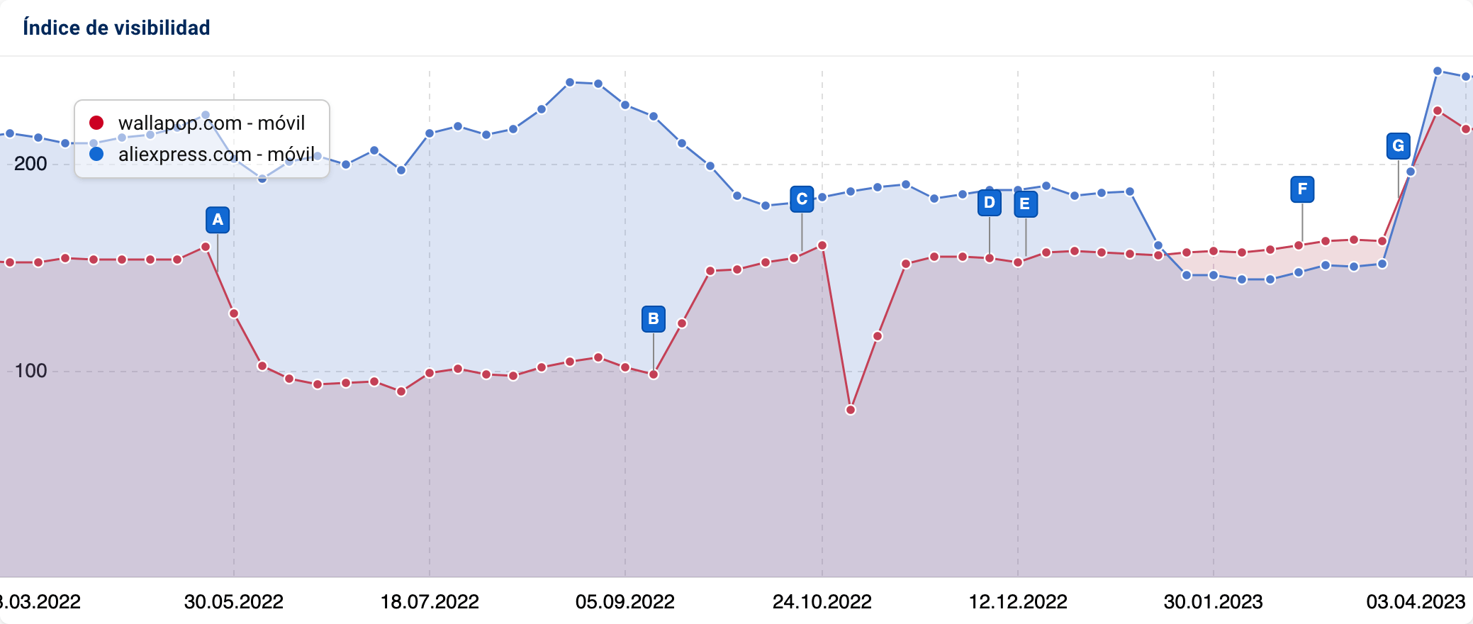 Aliexpress ha crecido un +62% y Wallapop un +36%. Como se puede observar fueron también afectados en el Core Update de Septiembre 2022 (B) aunque en direcciones opuestas. Un patrón que veremos repetirse en otros sites más adelante. Lo interesante es su patrón similar en este Core Update de marzo 2023.