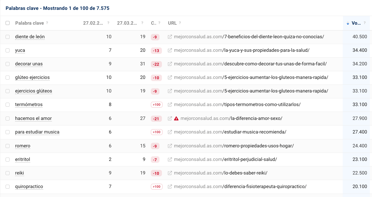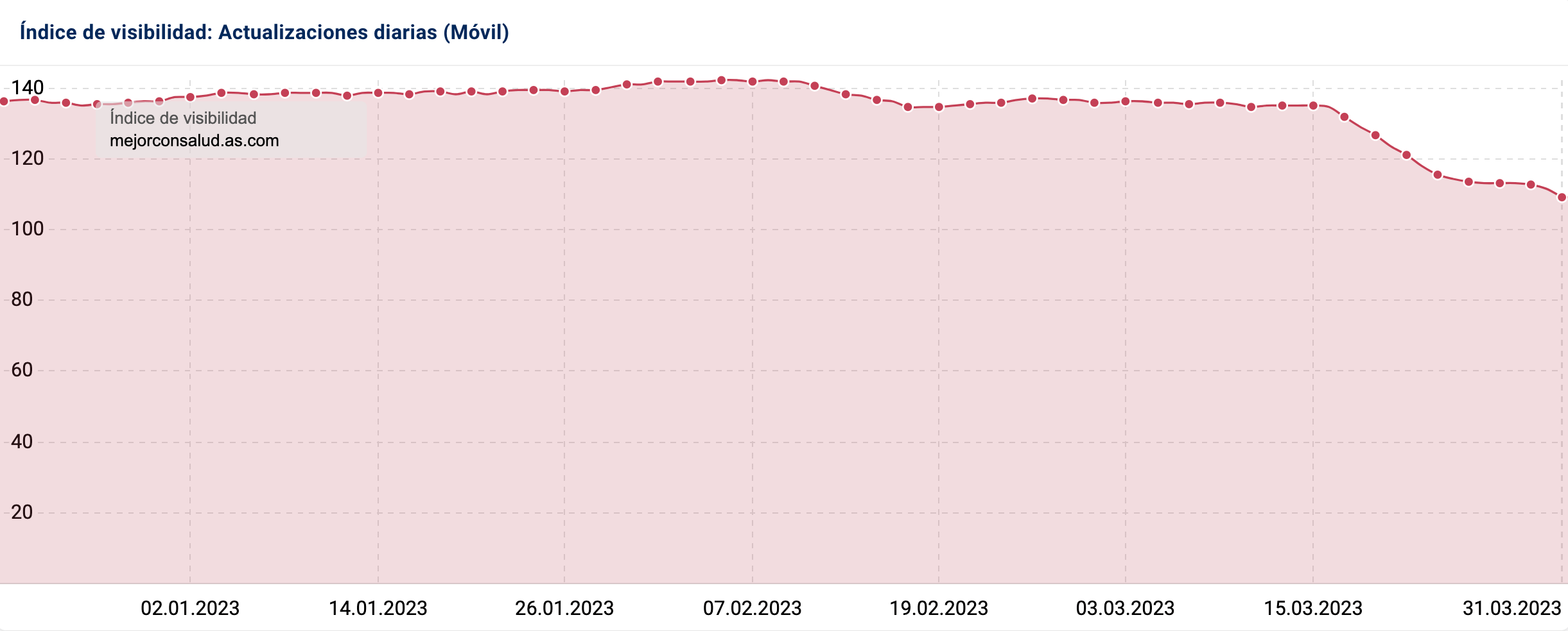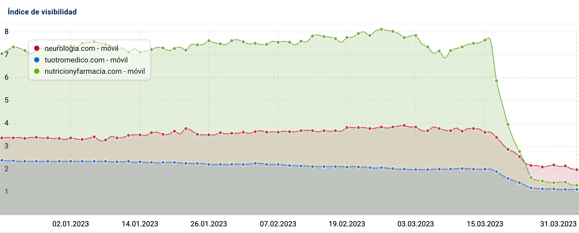 «mejorconsalud.as.com» perdió un 20% de visibilidad. Aun así lo veo como un daño colateral. Cuando miras los criterios donde realmente perdió tráfico te das cuenta que o no “le correspondían” por generalistas o simplemente eran búsquedas de criterios “triviales” no médicos. Algo que he visto en el análisis de mis clientes englobados dentro de esta categoría.