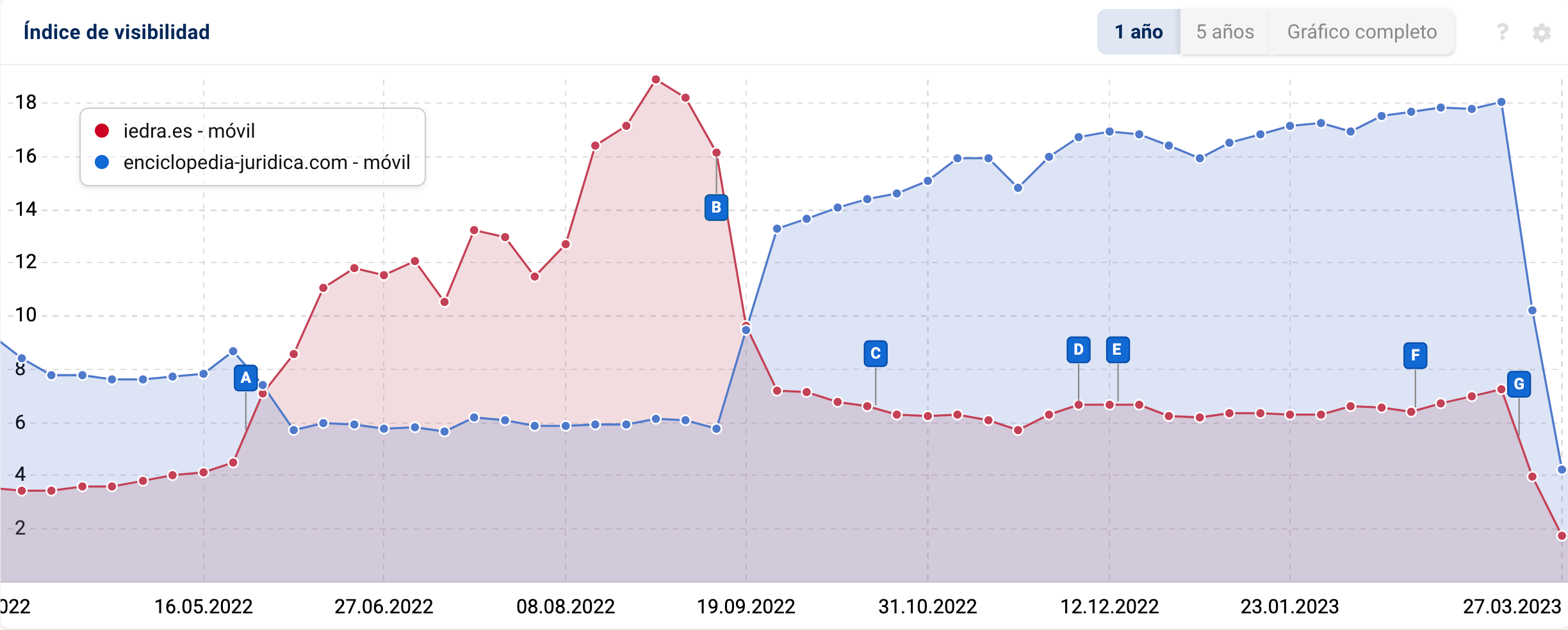 «iedra.es» (-78%) y «enciclopedia-juridica.com» (-77%). Los proyectos automáticos nacen con fecha de caducidad, y son durante los Core Updates cuando arrancan o mueren. Los dos fueron afectados en Septiembre 2022 y ahora los remataron. Me comentan algunos SEOs que ha sido una escabechina. Aunque estos dos seguro que fueron muy rentables.