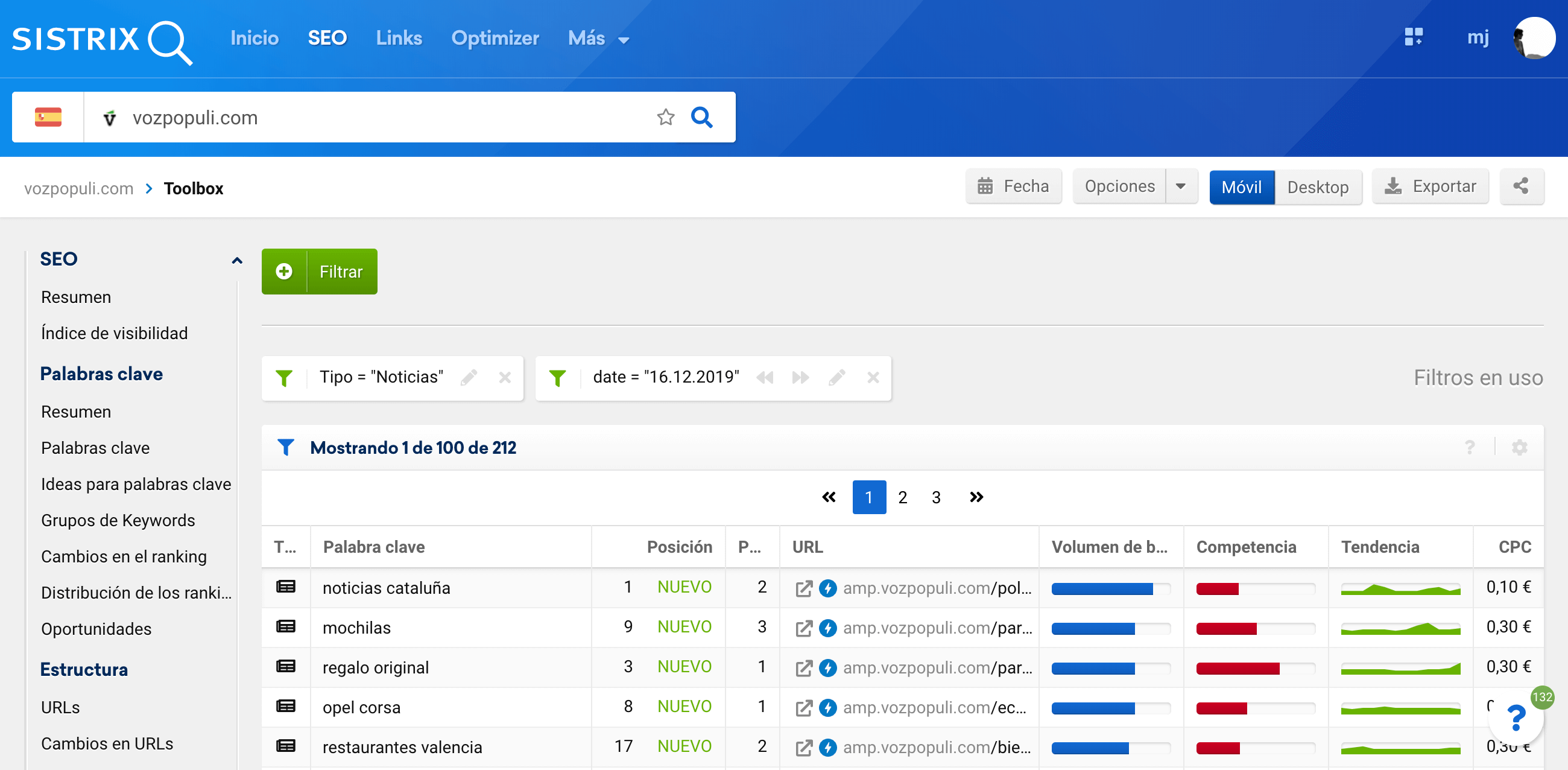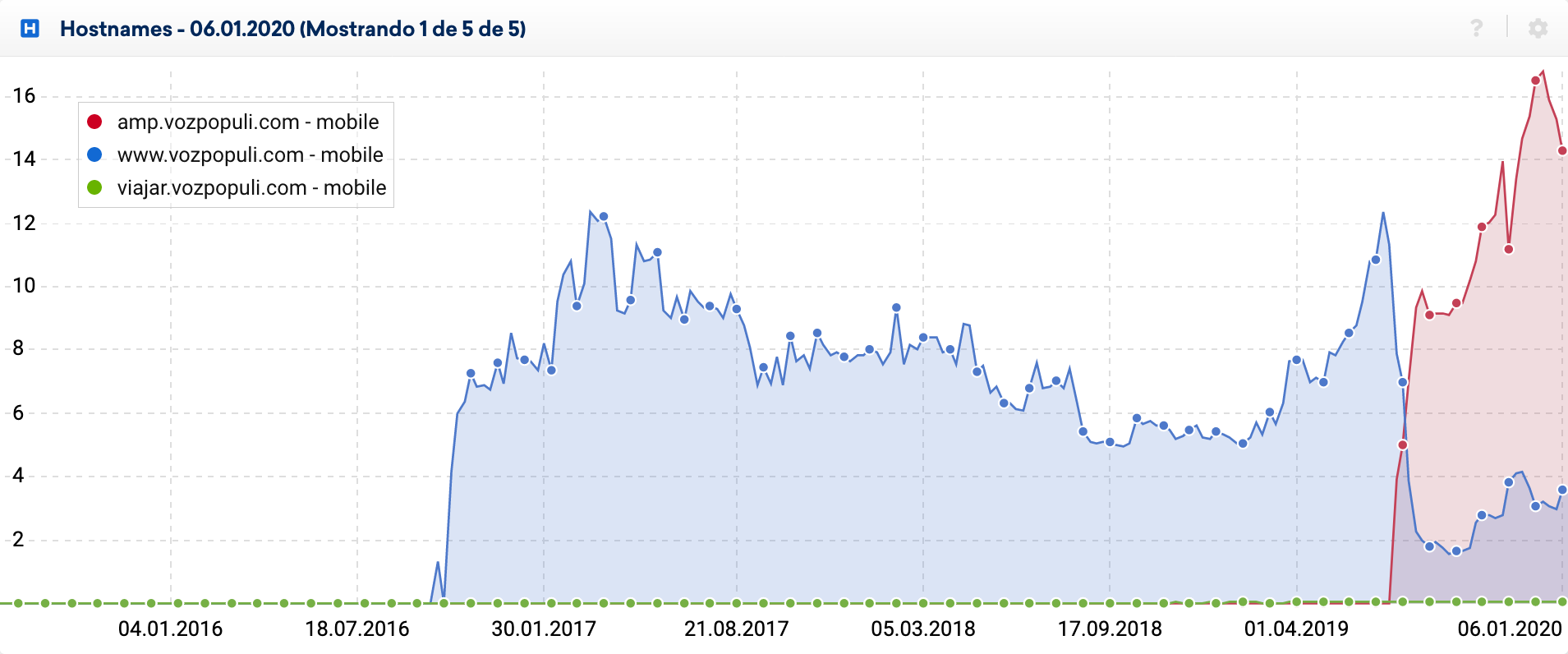 La implementación de AMP en julio de 2019 ha sido determinante para el crecimiento en SERPs para móvil, donde los carruseles de Noticias se nutren de este tipo de resultados. Voz Populi acumulaba 2 resultados a principio de año y con AMP logró multiplicar las apariciones en el bloque de Noticias .