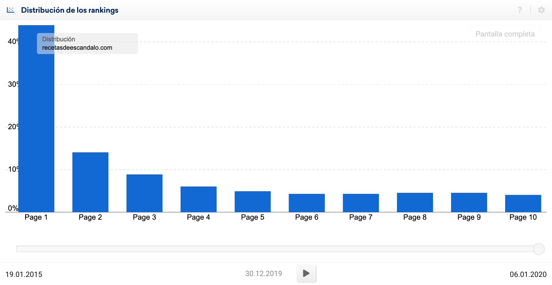 recetasdeescandalo.com Con todos los cambios que ha habido en materia culinaria por parte de Google, éste es un gran ejemplo de crecimiento donde se puede observar la principal mejora: ha pasado de tener un 19,89% de posiciones en primera página a principios de año a casi duplicar a final de año, con un 43,90% :