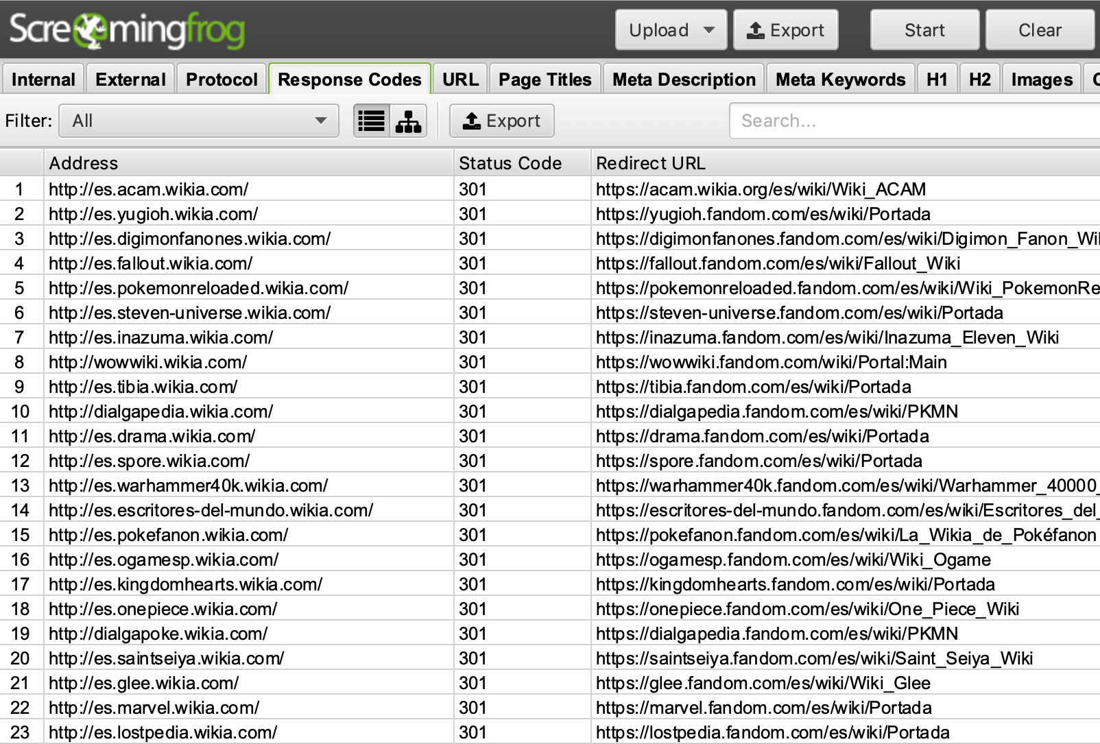 La misma estrategia de subdominios se ha mantenido en la página web destino de la migración que es Fandom. Analizando donde están aterrizando los principales subdominios, vemos que se usa 301 para mover los contenidos :
