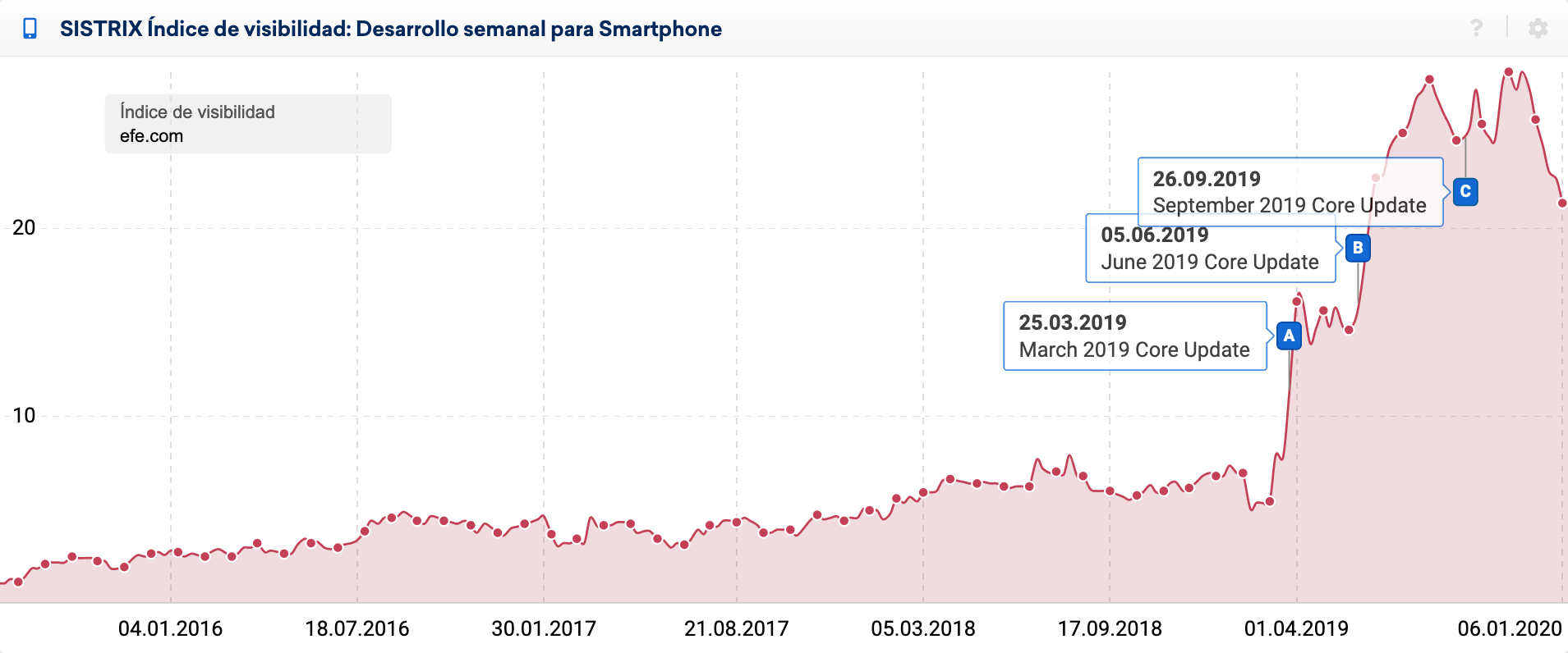 efe.com En el caso de la agencia Efe vemos que ha ido superando satisfactoriamente las sucesivas actualizaciones Core de Google, hecho bastante meritorio en los tiempos que corren: