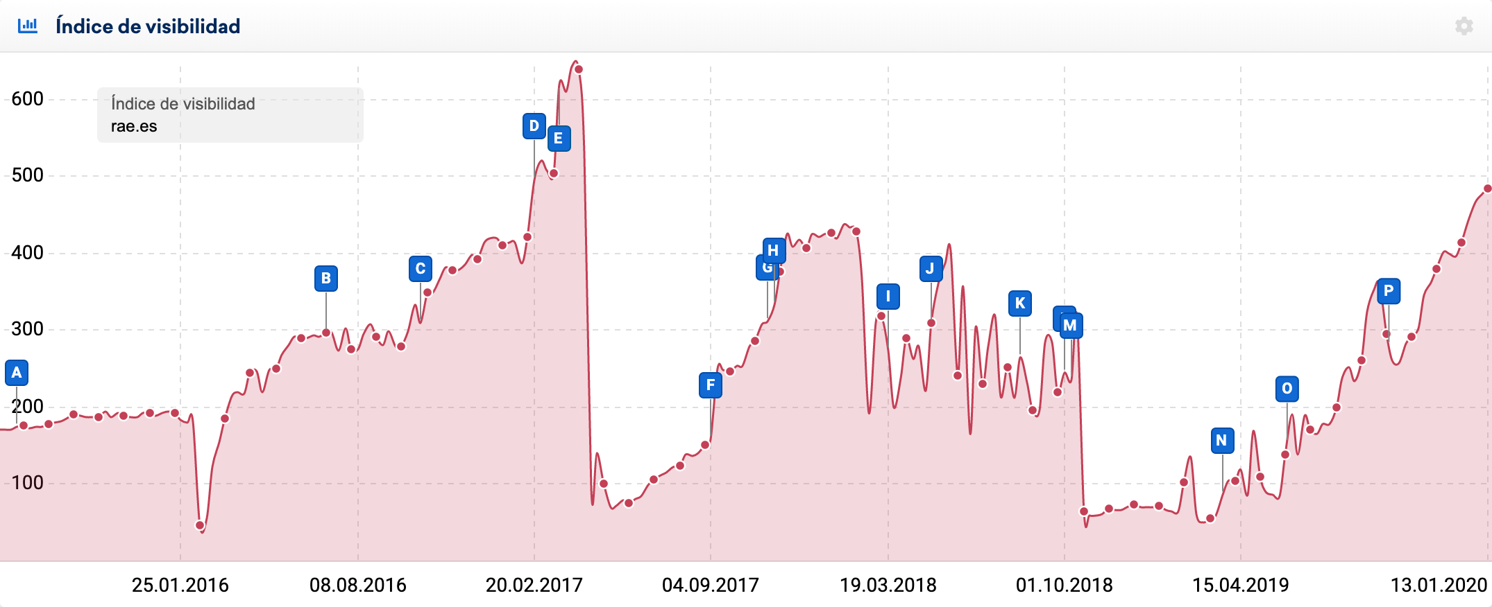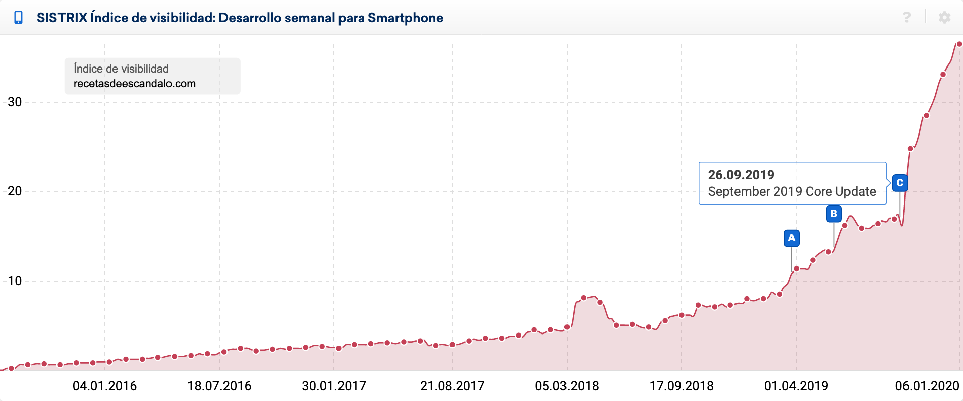 Como se ve en la gráfica, de febrero a septiembre (poco más de 6 meses) pasa de 37 puntos hasta 293 puntos de visibilidad, hasta llegar al Core Update de septiembre que le afectó de igual forma que el Core Update de marzo de 2018 .