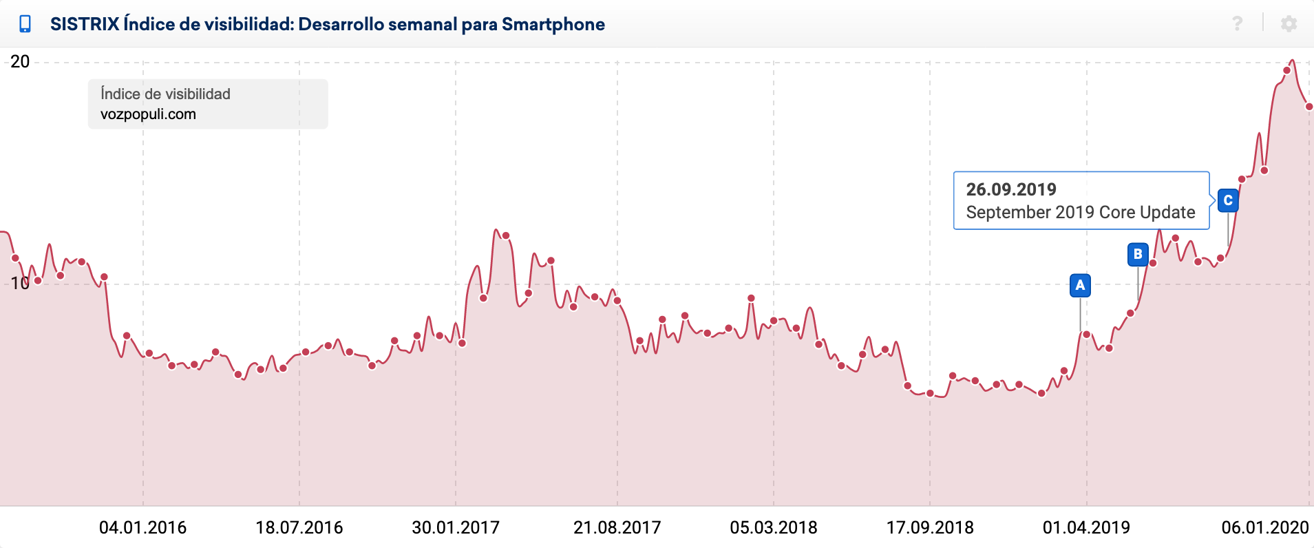 Por último, también podemos destacar y hacer referencia a la actualización Core desplegada en septiembre y confirmada por parte de Google en su cuenta de Twitter, Searchliaison, de la que Voz Populi salió victorioso :