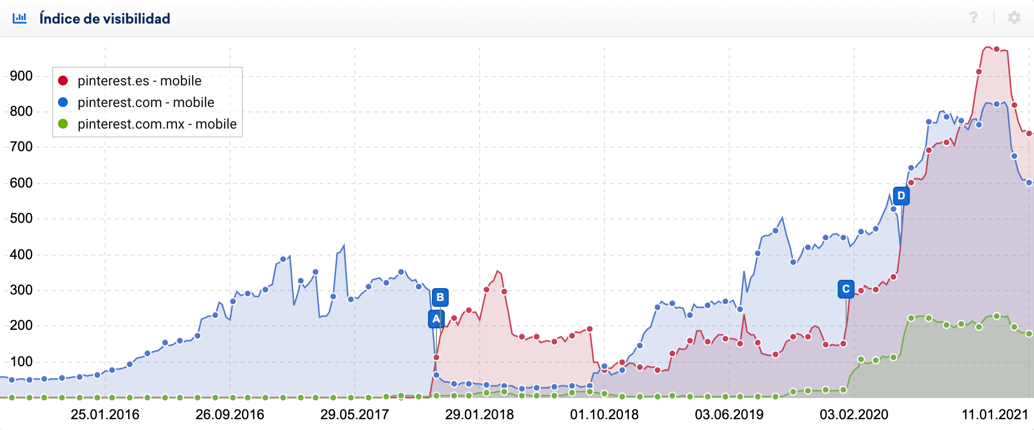 Y no solo hablamos de un contenido excepcional y un enlazado interno que daría para escribir un libro, sinó que quiero destacar el hecho de ir contra corriente en ideas preestablecidas en la comunidad SEO. Desgeolocalizar sus dominios eliminando el Hreflang entre ellos. Si observamos, vemos como Google tras el Medical Update del 2018 empezó a desgeolocalizar muchos dominios médicos, pero no solo médicos. Así que Pinterest aprovechó la situación.